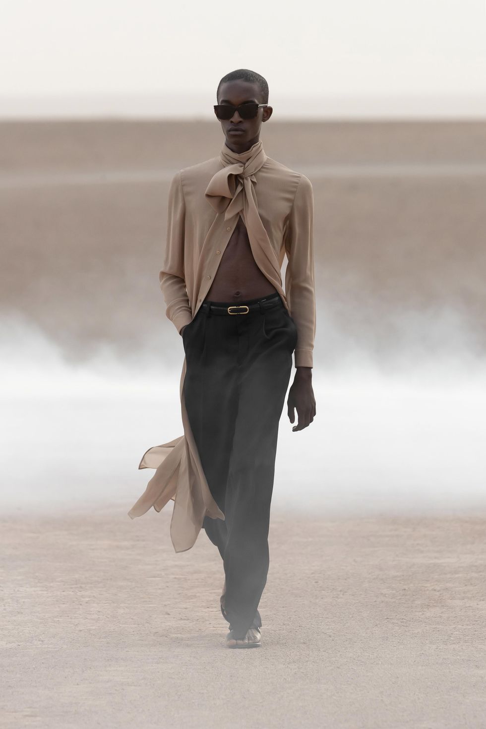 This season, Vaccarello was inspired byThe Sheltering Sky, a 1949 existential novel by Paul Bowles set in North Africa, whose excerpts were listed in the show notes.
