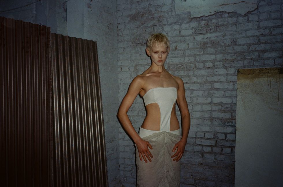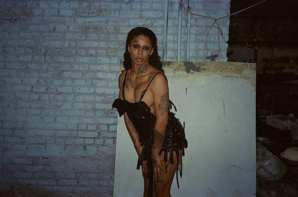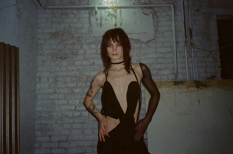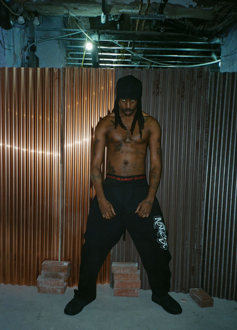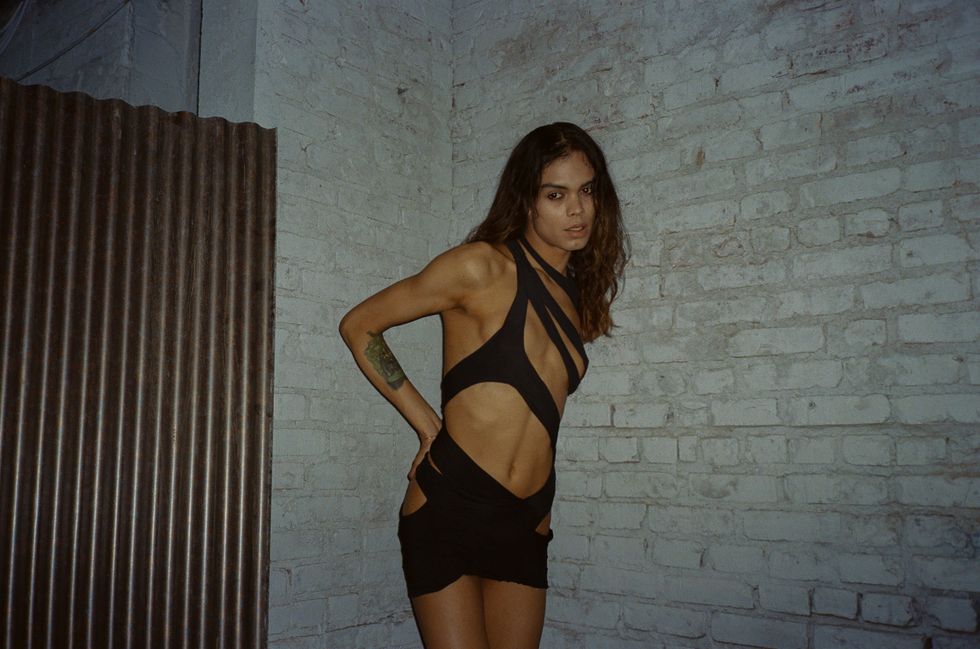 Like exiting the ramp of Basement at sunrise, models (Raven Valentine, Merlot, Fabiana Love) stormed the space one by one, some flirting with the front row and others barely making it up the stairs as if strung out and dragging a half-empty jug of Poland Springs. Women’s outfits were sleazy, clubby and clung to the body, looking like lovers for all the men who emerged in Almost-branded streetwear. Everyone gathered around a DJ booth in the center, smoking cigarettes and cruising each other.