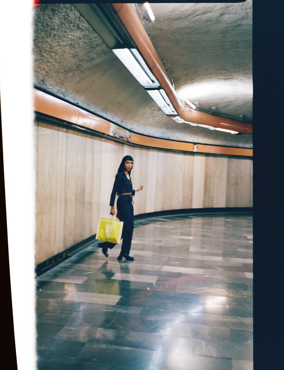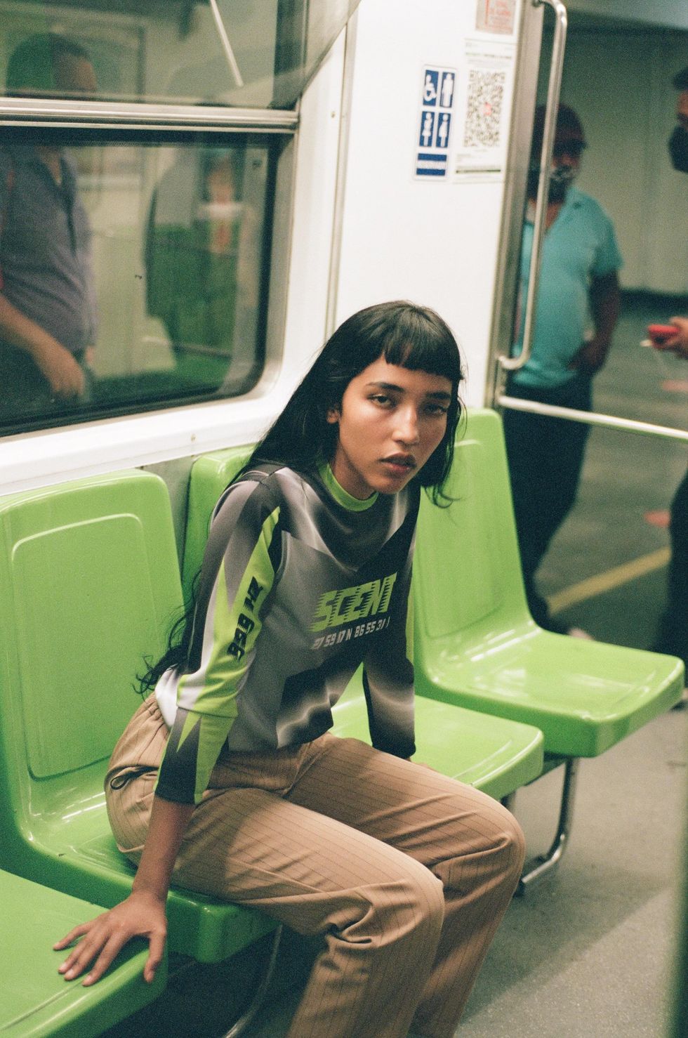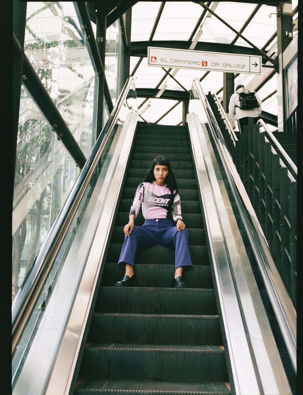 The accompanying campaign underscores these ideas, set against a Mexico City subway station — or "Metro Insurgentes," as Valdes says, adding that it's a "a Mexico City landmark and a place where so many people come in and out from everyday. It shows the dynamic movement of the city pretty well. The saturated bright colors of the trains and the cold marble floors matched perfectly with the clothes and the spirit of the new drop: beauty and movement in everyday life."