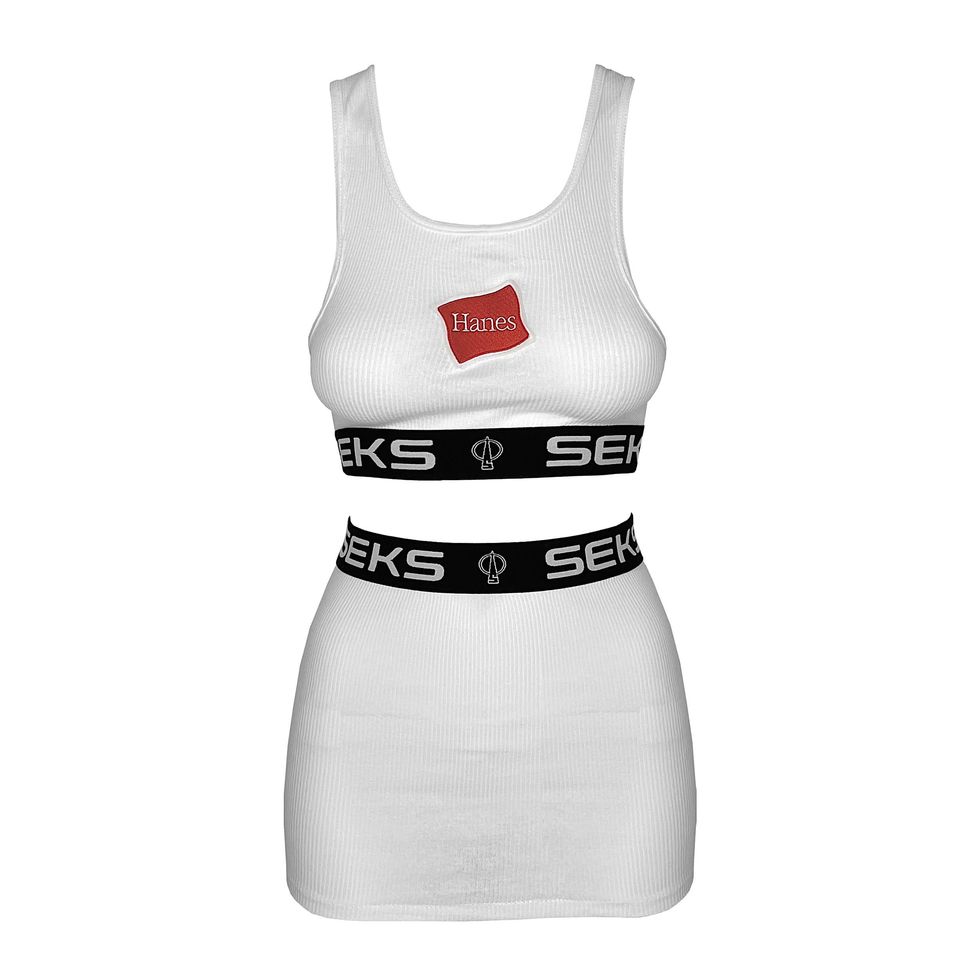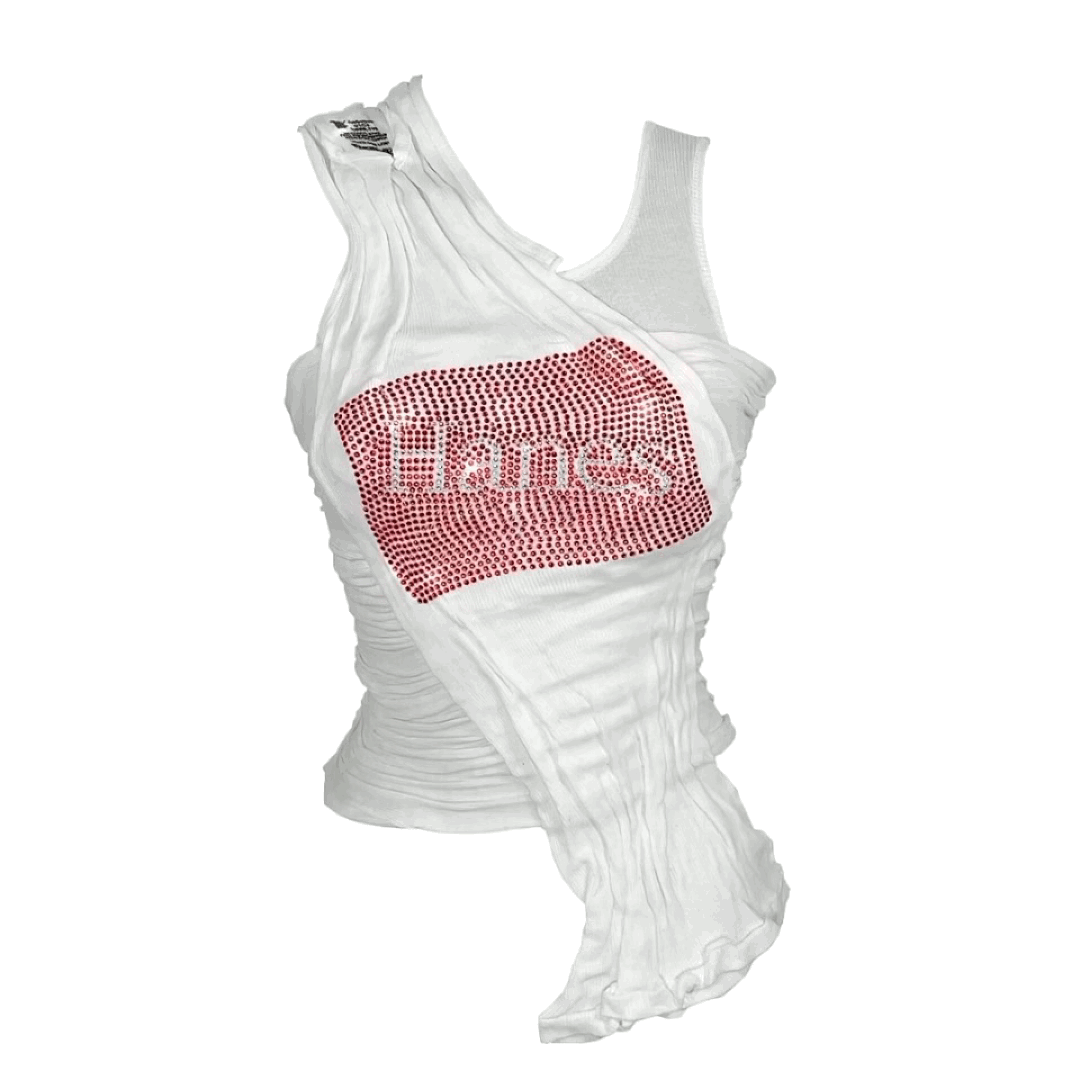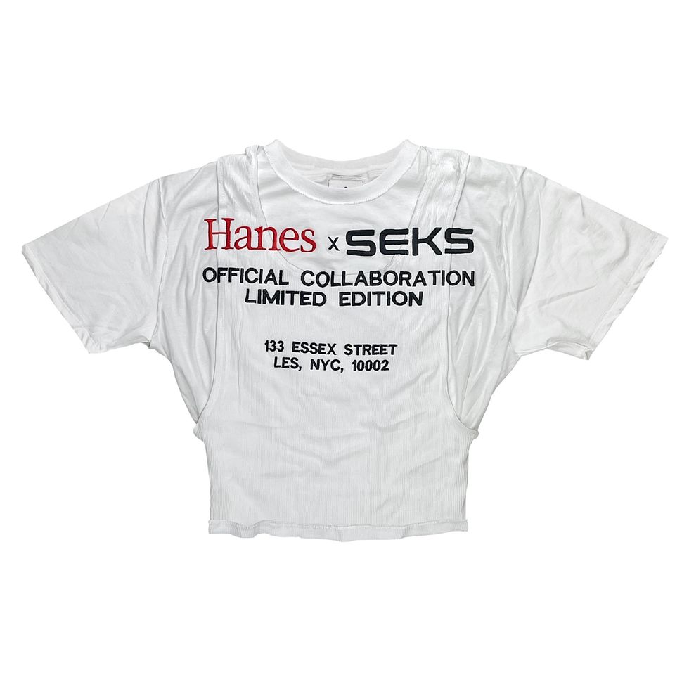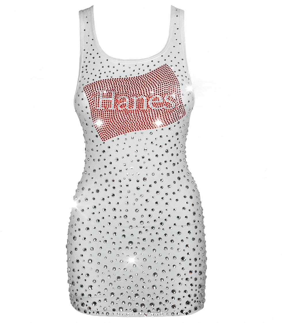 She tagged both brands in an Instagram post afterward which Hanes reposted. Eventually Seks slid into Hanes' DMs which led to them talking about teaming up. The final result, which launches this week, is a 200-piece collection of tees ($95) and tanks ($80) with crystal co-branded logos.