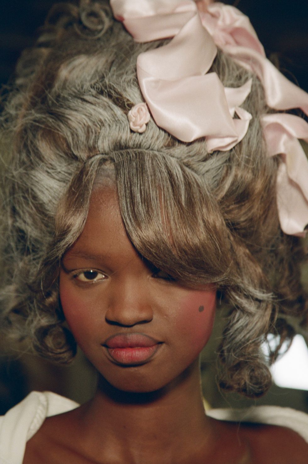 The cherry on top of the show was the hair by Linh Nguyen and makeup by Lottie, which also drew inspiration from the era — wigs reaching the sky and decorated with feathers, bows and tchotchkes, with powdered faces and cheeks covered in blush.