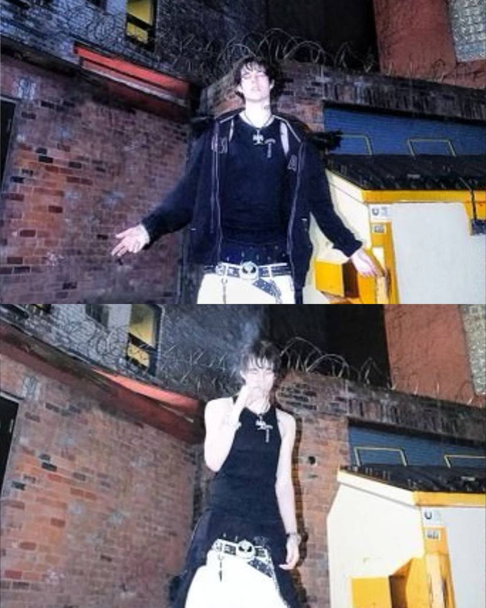 “It’s easy to make cool imagery with that shit,” Steckler tells me when I ask about the horror references. We meet backstage at Brooklyn Steel before his headline set, and I can’t get over how tall and scarecrow-like he is in person — as if The Creeper from Jeepers Creepers was dripped down in custom Louis Vuitton. He’s jittery and avoids eye contact, but still sweet and attentive, eager to talk about the universe he’s created and to show me a DM he got from his idol Yung Lean. It becomes clear that underneath all the gore lies a pure, passionate student of music production and visuals who has been manifesting this spooky, sadistic artistic utopia his entire life.