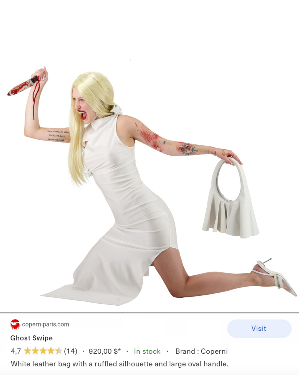 Fashion's favorite holiday is creeping up next month, and cool Parisian brand Coperni is making a play for your Halloween wardrobe. In honor of spooky season, the label launched a capsule collection of pieces that are chic yet worthy for any scary function. The Coperni Swipe bag gets reimagined in a soft leather finish for a ghost-like effect, while a jumpsuit featuring its signature cutouts comes with a fabulous cat hat. And the Devil Glass bag is just the piece to finish off any Halloween look.