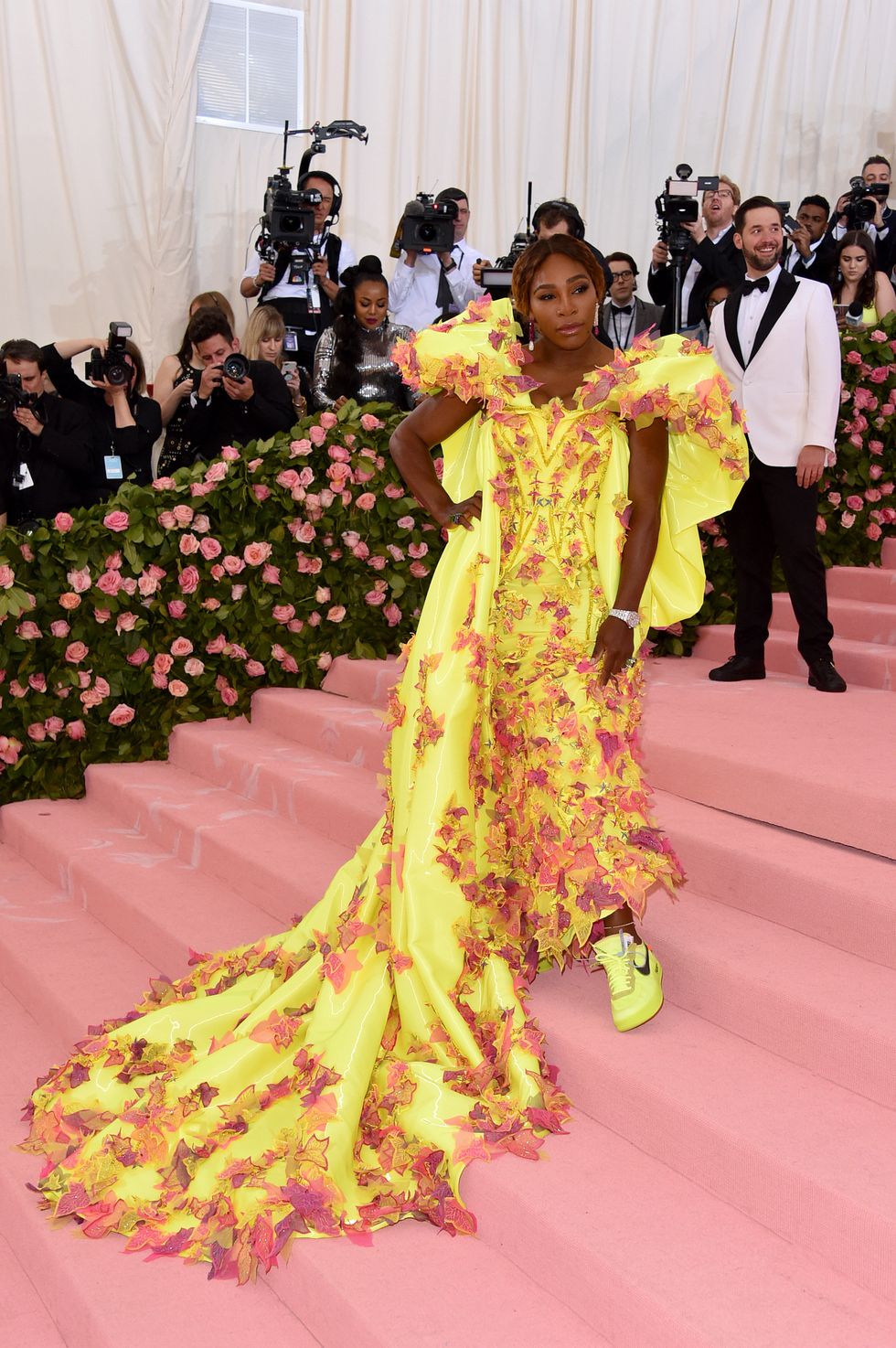 Serena Williams, who is co-hosting this year's "Notes on Camp"-themed Met Gala alongside Lady Gaga, Harry Styles, and Gucci's Alessandro Michele, found a way to wear Nike x Off White on fashion's fanciest red carpet. She paired her neon yellow Air Force Ones with a fluffy (and yes, slightly Camp) Atelier Versace gown. #ComfyCamp! Let's get it trending.