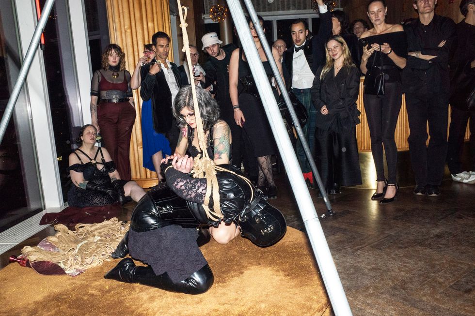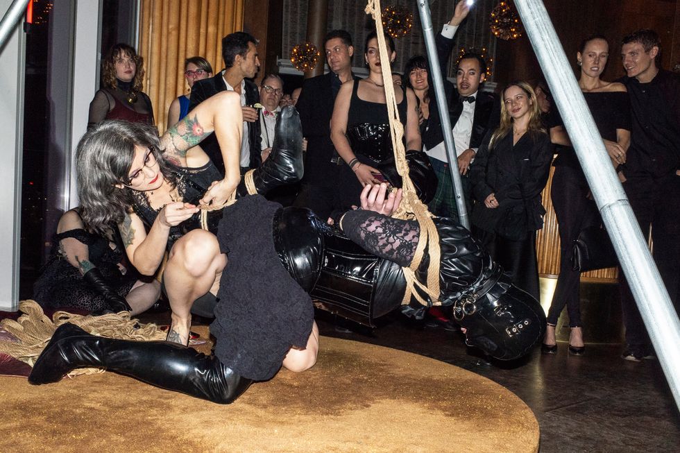 The Shibari performance unfolded right after the string quartet, creating a striking contrast. Mistress Trixie and I led a gimp in Shibari rope through the crowd while Jacob Rudin's live and electric flute set an eerie, hypnotic tone. The delicate yet provocative nature of the art stirred curiosity and emotion — so much so that even the housekeepers in their maid uniforms couldn’t resist sneaking into the room to witness it. The irony of it all was that the submissive was wearing a gimp suit with a maid’s apron. As for whether I’ve ever partaken... Well, you’ll have to come to Paris and find out for yourself.