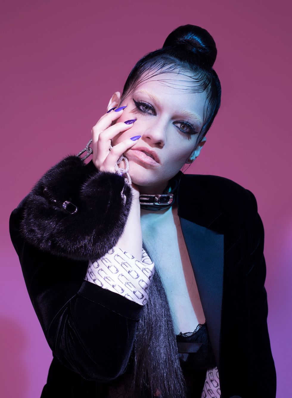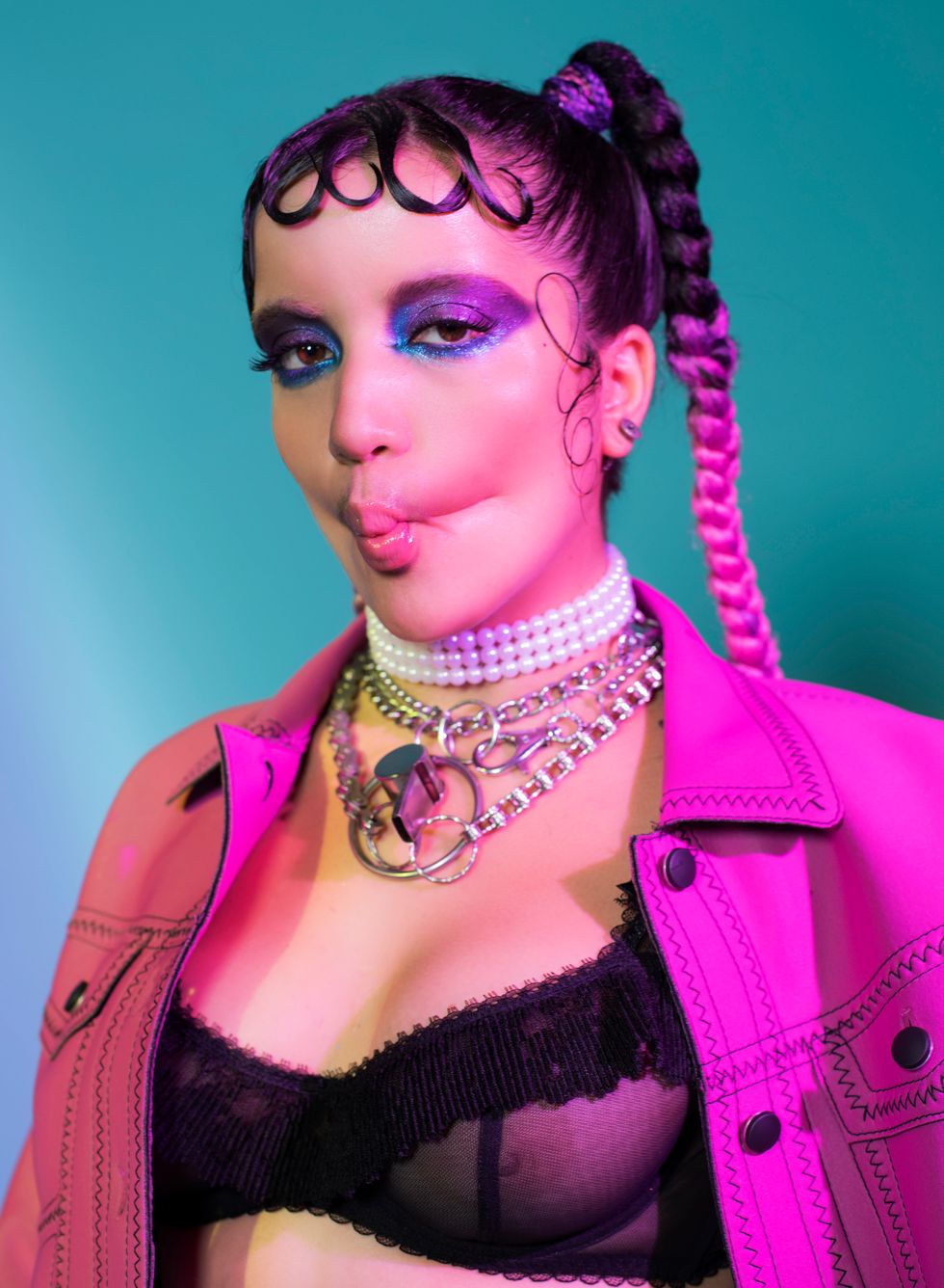 Jacket & Skirt: Jeremy Scott, Bra: Agent Provocateur, Necklaces: Pauli Cakes