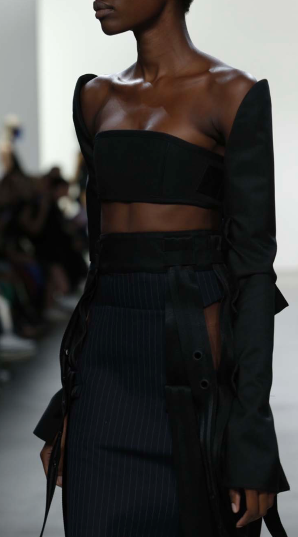 My whole ethos is about strong women, especially strong women of color, especially especially strong black women of color, so that's why I used rugged materials. Solange wore a couple pieces from my MFA collection — the triple strap double sleeve, which is a two-piece sleeve that's broken at the seem. You strap the two pieces together, and there's this hidden elastic inside that you slide onto your arm. Then there was a bandeau and a body bag that her stylist Kyle Luu, who is amazing, flipped upside down and buckled in a different way. Basically all of my pieces are interchangeable. They combined three different looks, and then the pants she had on already.