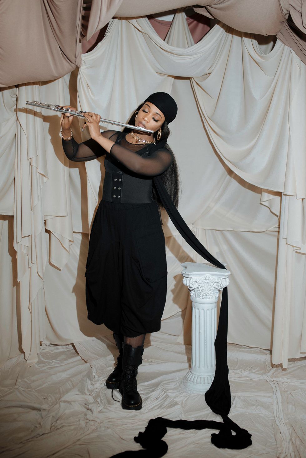 As far as the fashion and wardrobe, that is the combination of a couple of different brains. I think it's important right now for people of color in music to show that we have depth and duality, and that's why my flute is front and center. Even naming this freestyle "SITH" shows the spectrum of what Black women can be. I can listen to Kendrick, SZA, City Girls, and Solange all in one. I'm definitely channeling ghetto goth and paying homage to a lot of fundamental things that I love. My gold bamboo earrings, my Doc Marten boots, my 20 foot durag that was custom made are all very symbolic to the class and duality that exists with me. You have a classical instrument, which is definitely not considered an accessible thing for kids in the ghetto, and then the durag, which is the epitome of ghetto royalty.