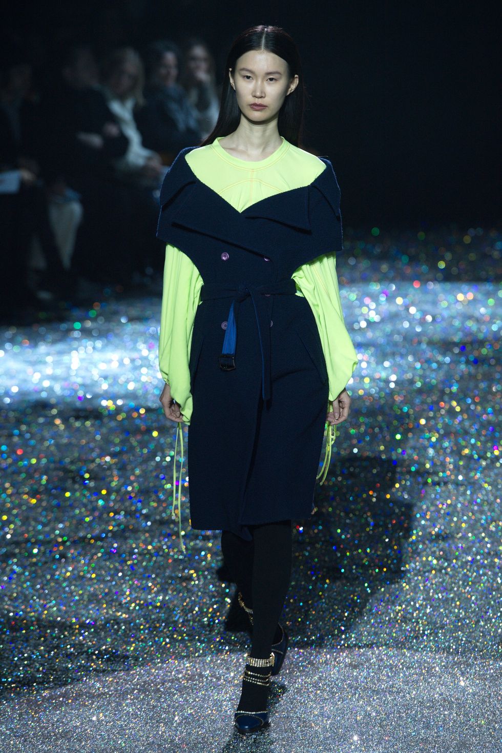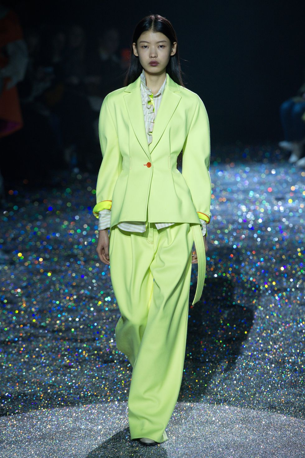 Several of the most stunning looks from the collection came in neon, highlighter shades of yellow and green. One sculpted suit seemed to glow against the backdrop of the dark glittery runway. Other neon pieces acted as the primary layer underneath navy and neutral dresses.