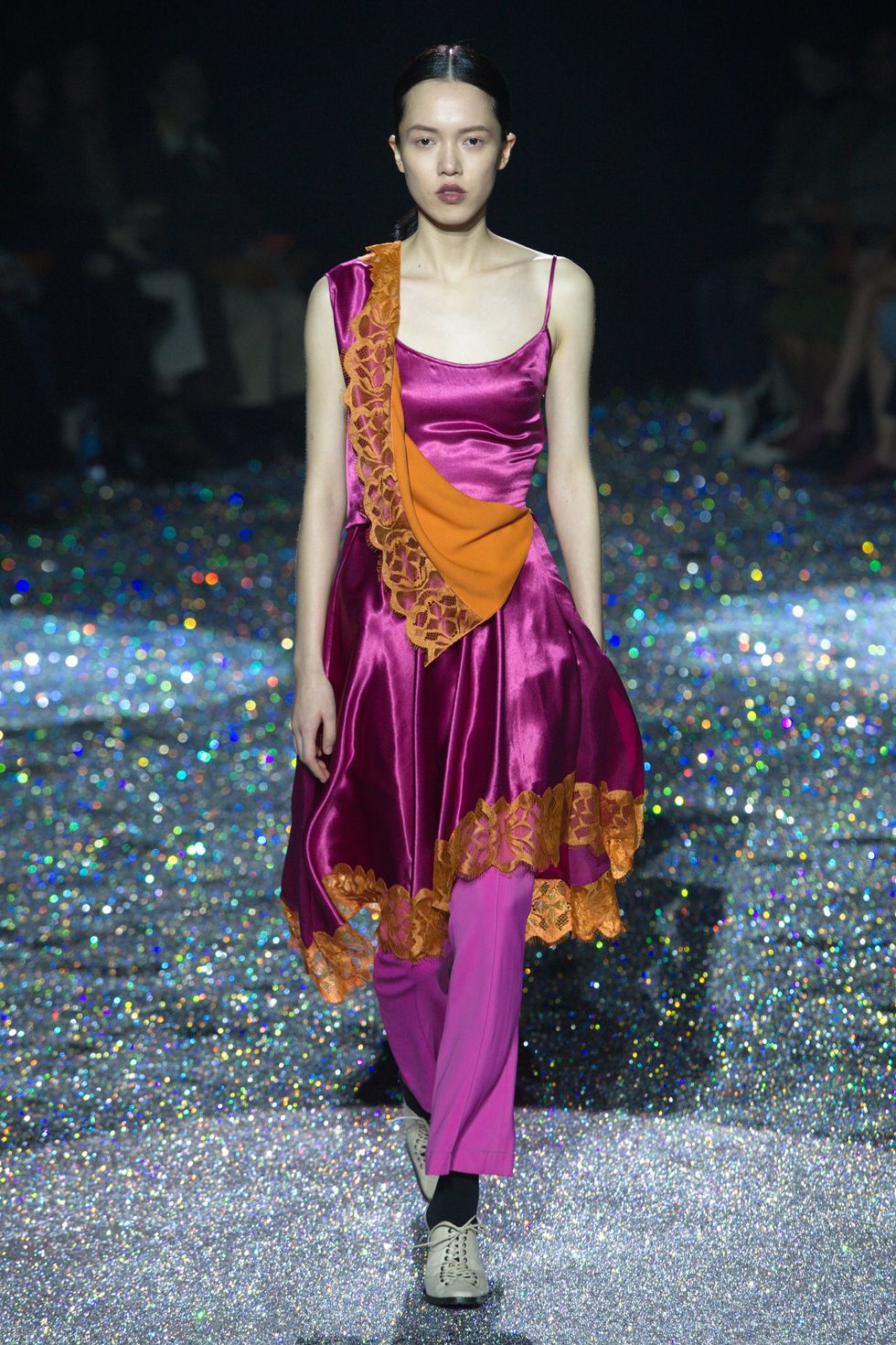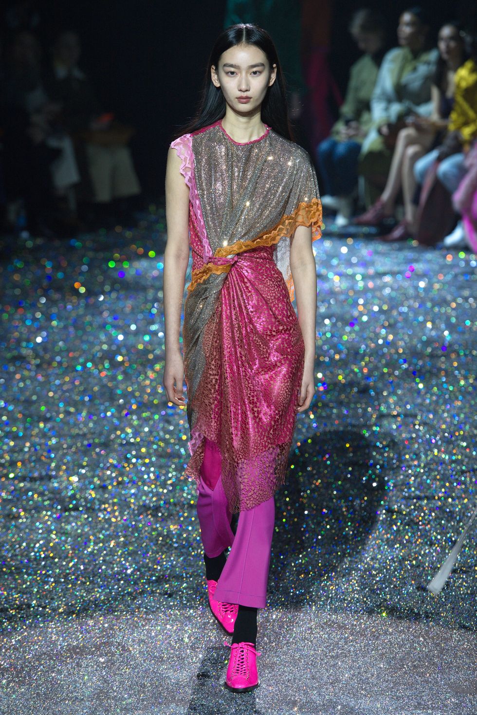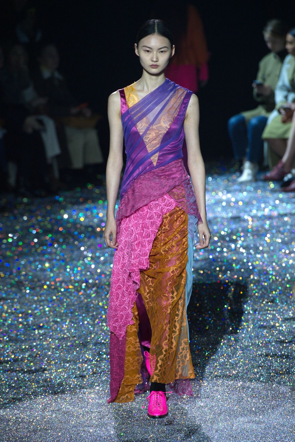Sies Marjan showed silky slip dresses for fall 2019 — but not in the way you think. Each one was draped with artistically placed fabrics trailing from the waist to the shoulders. Other lace dresses had collage-like collections of different colored textiles on the hemlines.