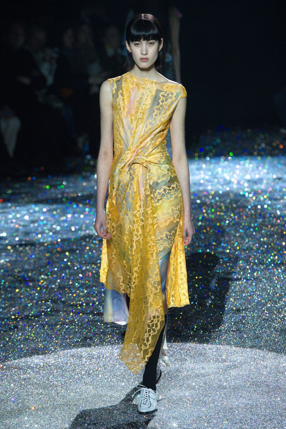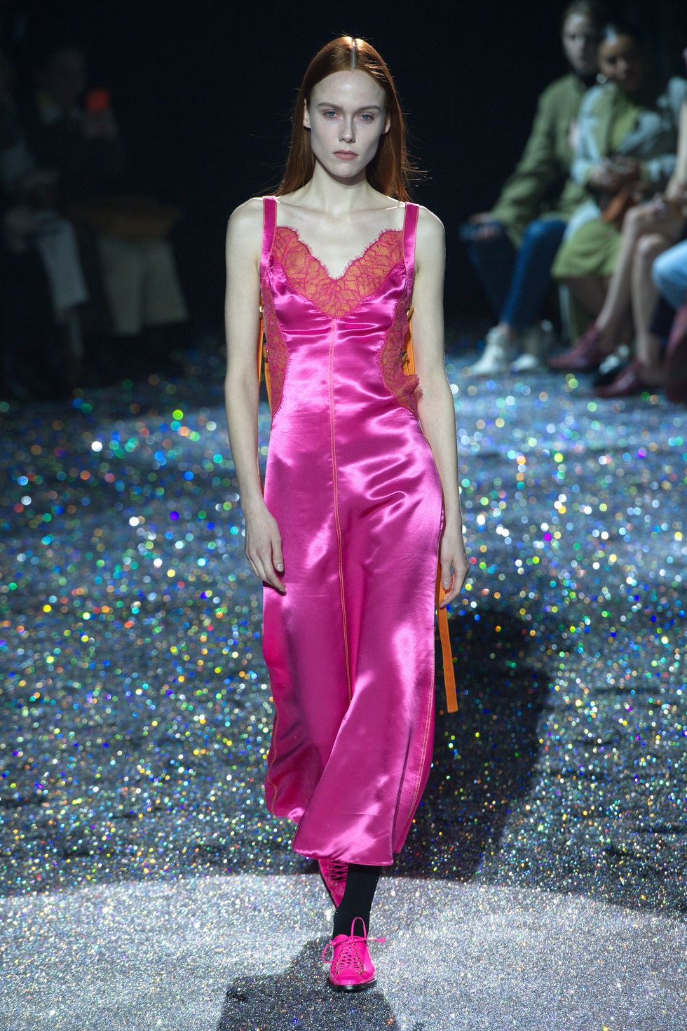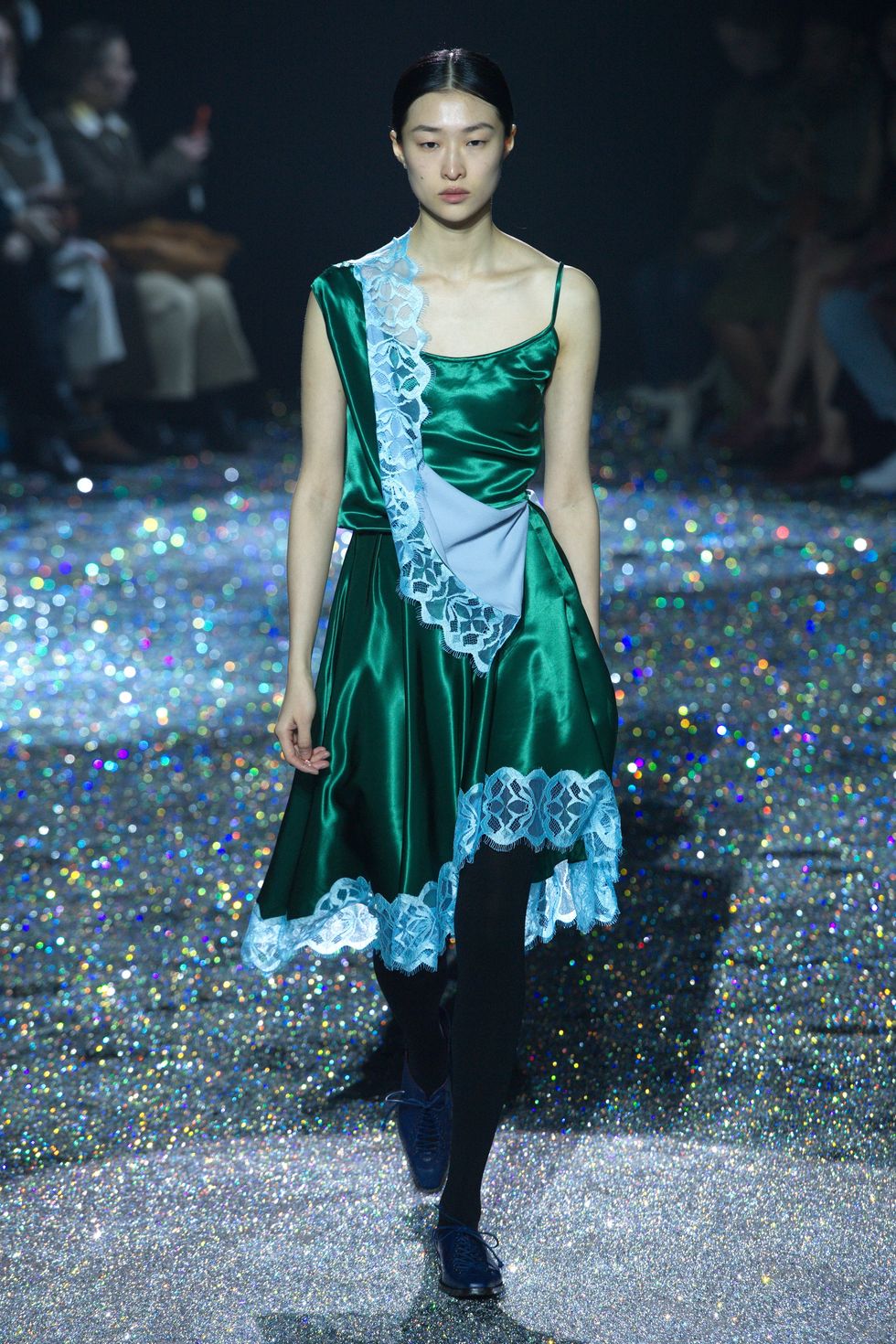 Sies Marjan showed silky slip dresses for fall 2019 — but not in the way you think. Each one was draped with artistically placed fabrics trailing from the waist to the shoulders. Other lace dresses had collage-like collections of different colored textiles on the hemlines.
