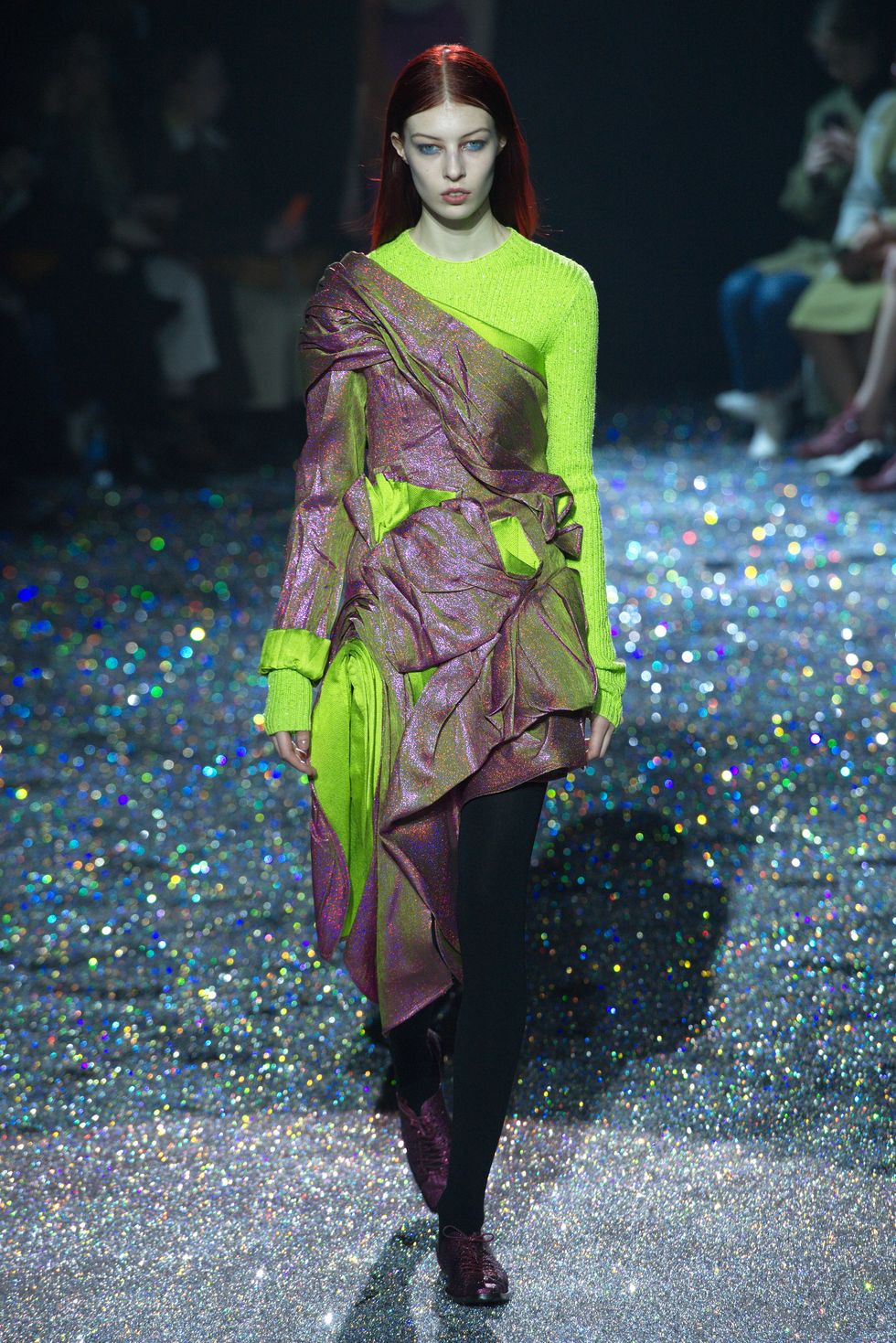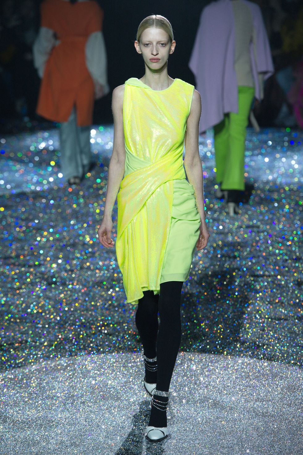 Last season, white iridescent jacket and bags that shifted to purple, blue, pink and silver under the light stole the show. Sies Marjan brought back that effect in a different way. One of the highlighter dresses had pieces of metallic iridescent fabric on it, and another green and purple dress had some shine to it.