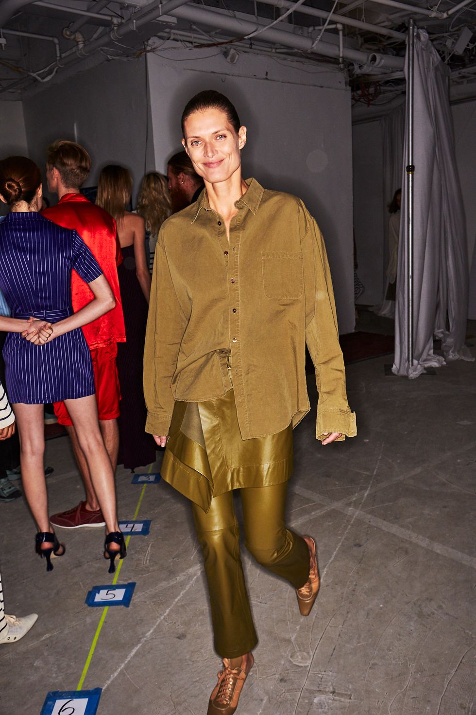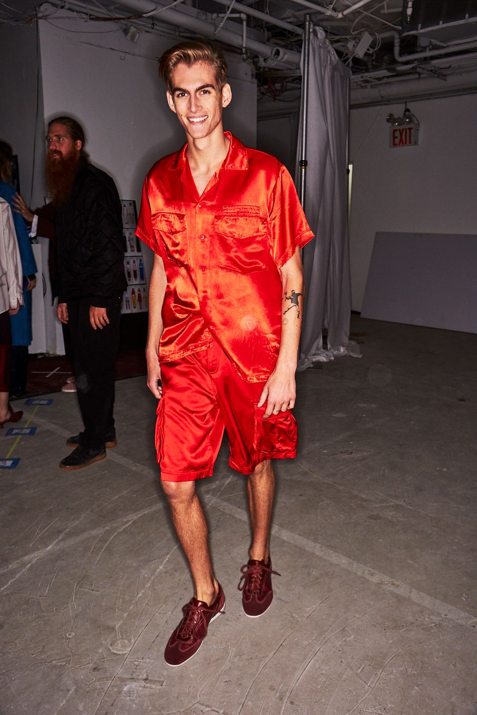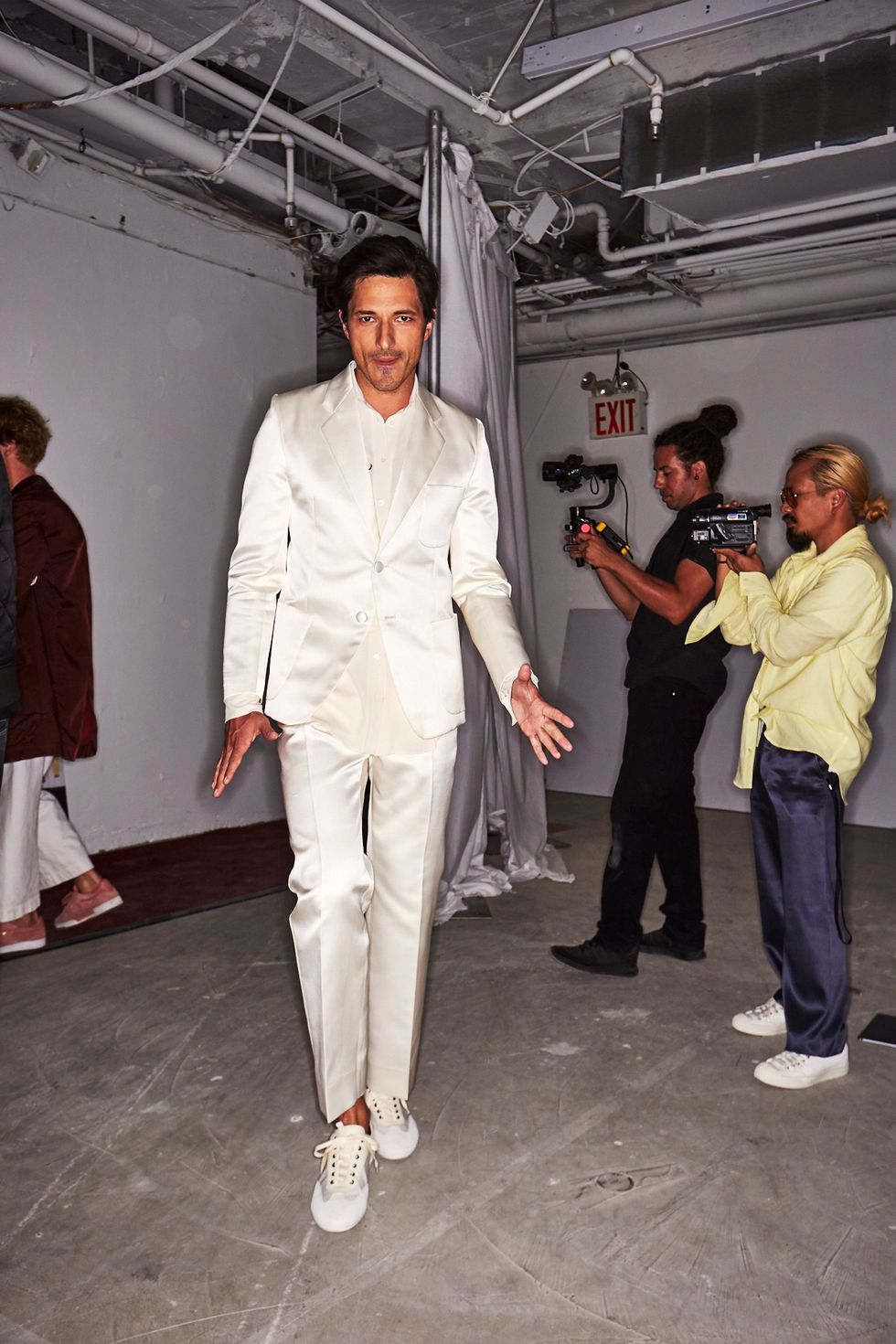 The show's cast was made up of people close to Lak including his mother Marjan (the 36-year-old's label bears his parents' first names, Sies being his father). She walked the runway in a gathered, polo-style tunic and a pewter skirt."It was tailor made for her last minute," he says, citing her eternal support and initial critiques about the garments' pocket placement and fit. "Having a moment where I can celebrate what I'm doing with the people I love is really great," Lak goes on. "Instead of just having them look at it, they're a part of it."
