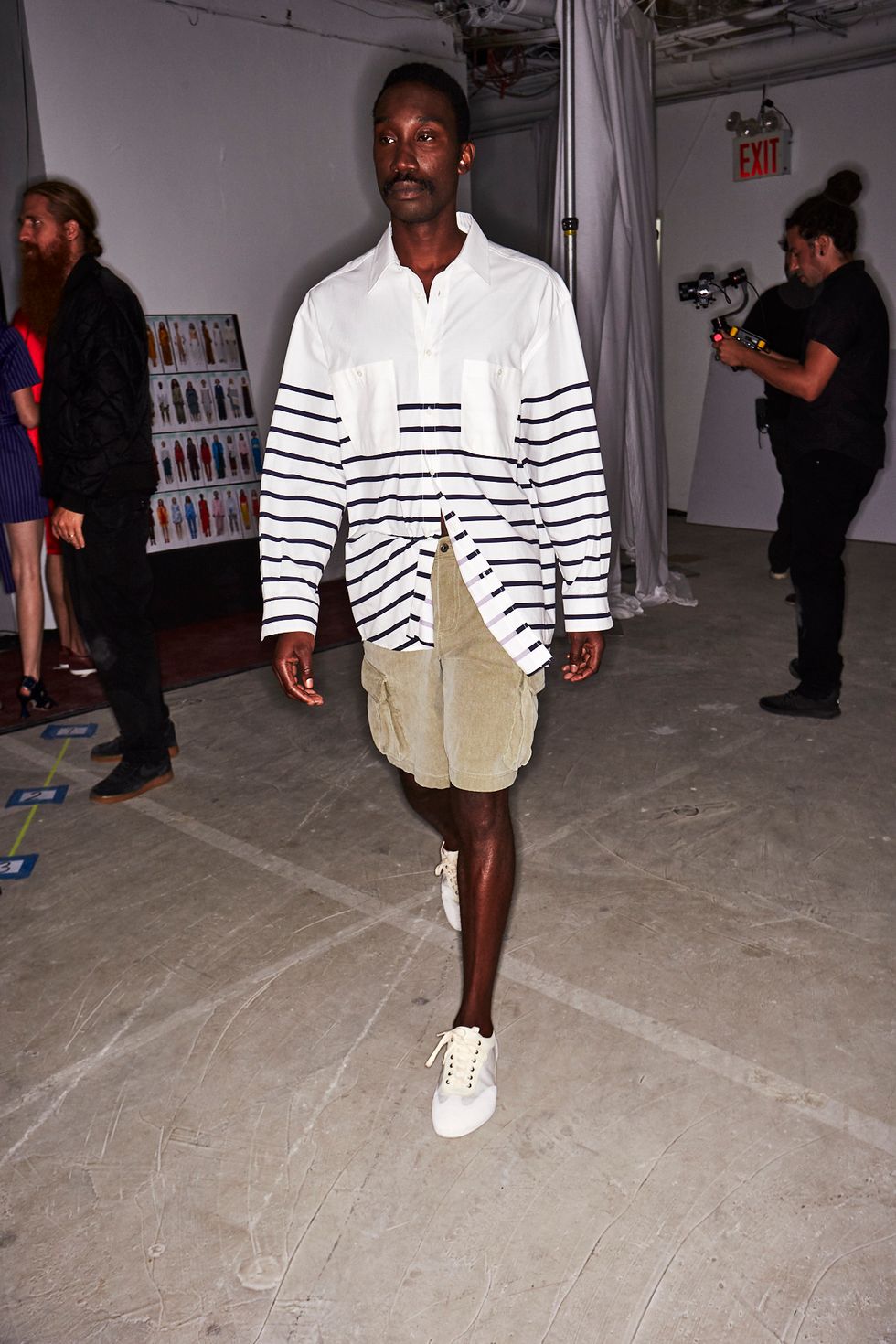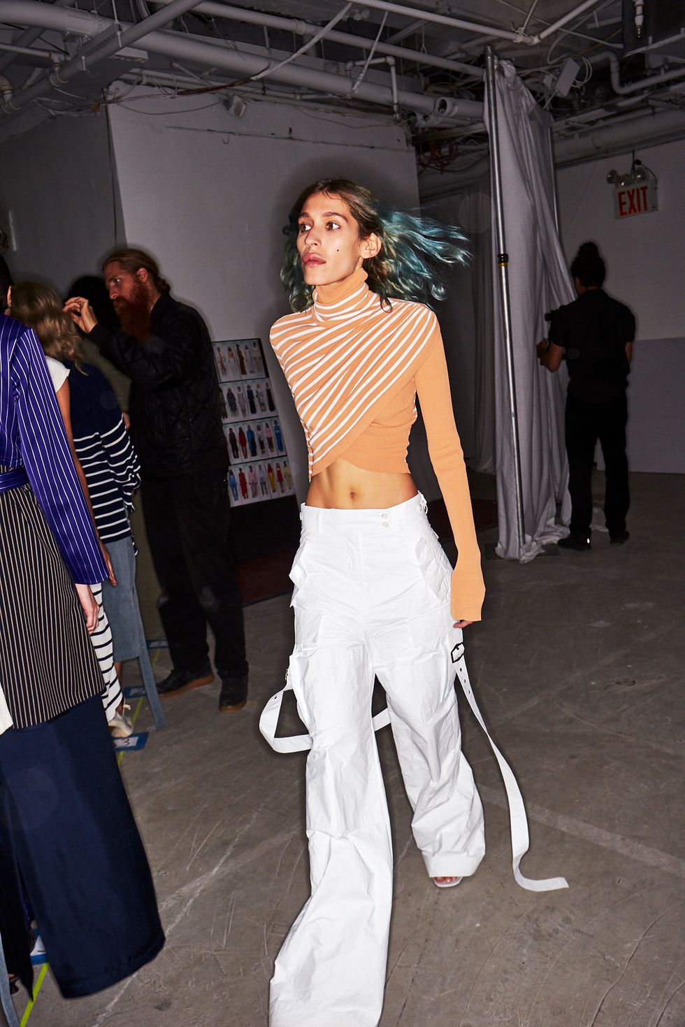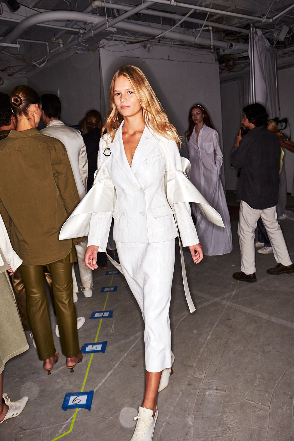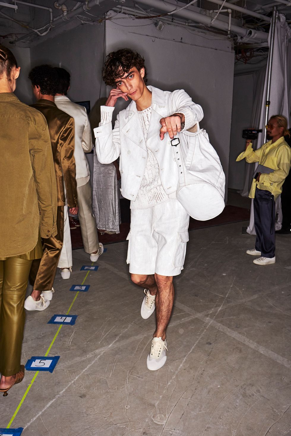 Since establishing his label three years ago, Lak — who's worked under master colorist Dries Van Noten — has saturated his garments with vibrant hues. This season, he embraced white, using the crisp color on shirting, dresses, cargo pants, skirt-suits, and more. "When you work with color a lot, it can really overtake [the garment]," he explains backstage. "This was an opportunity to focus more on texture."