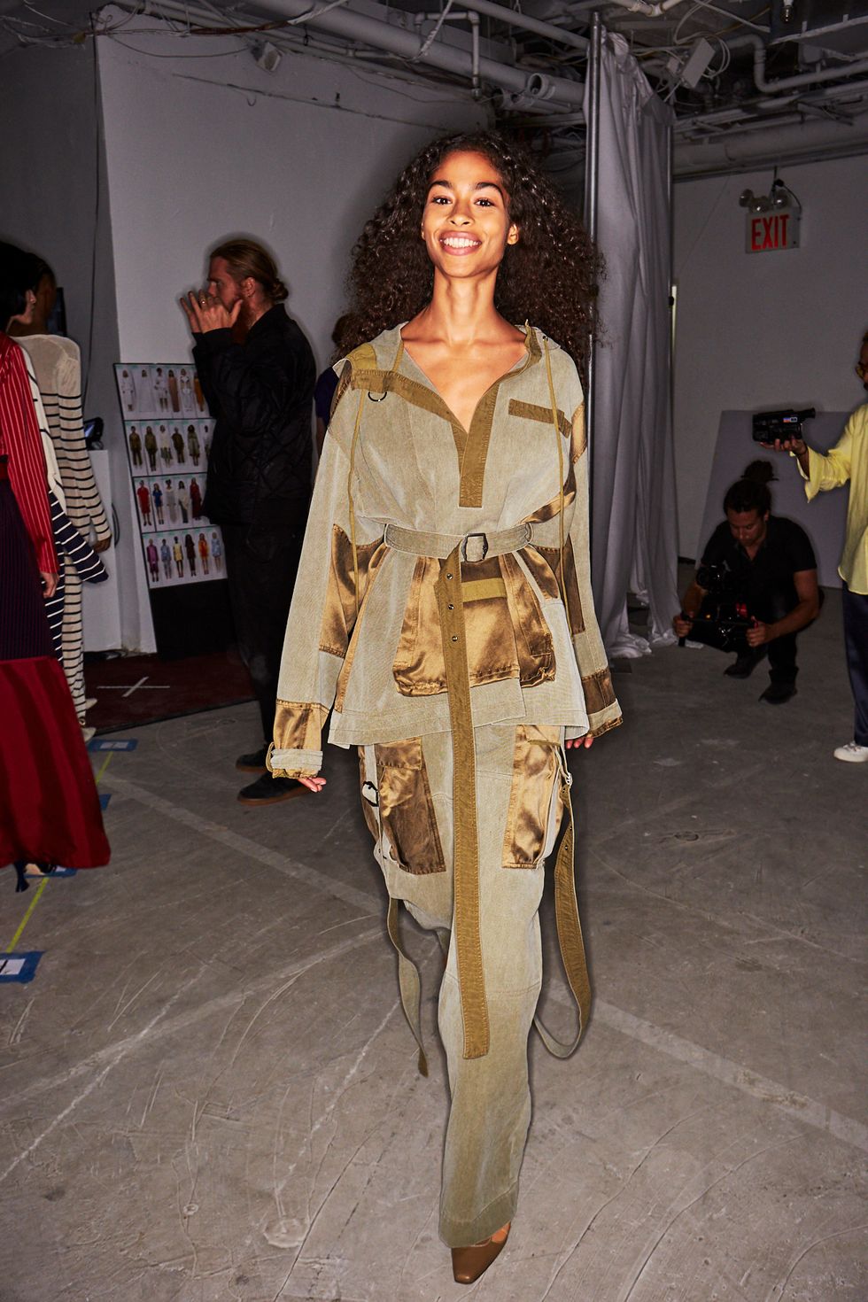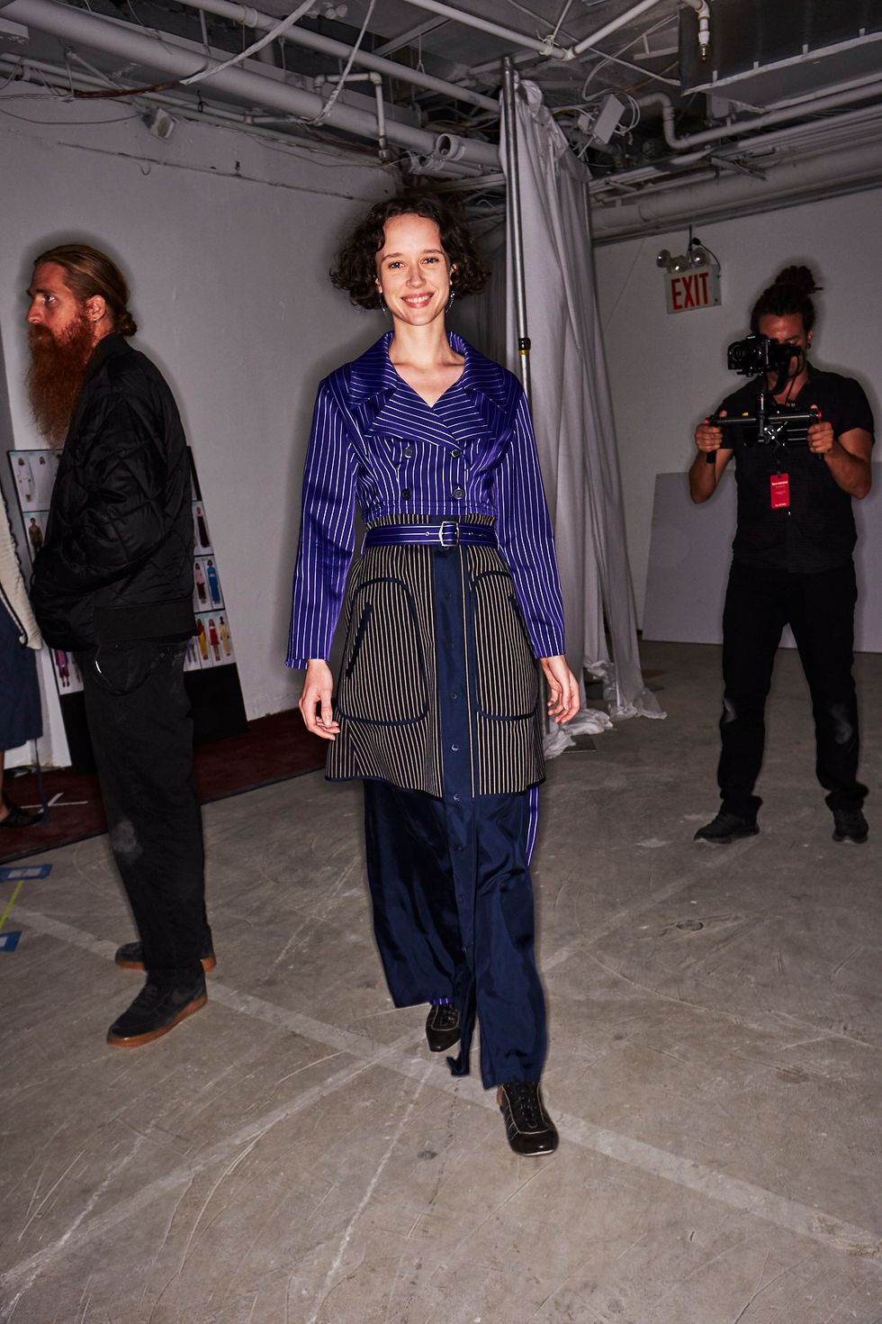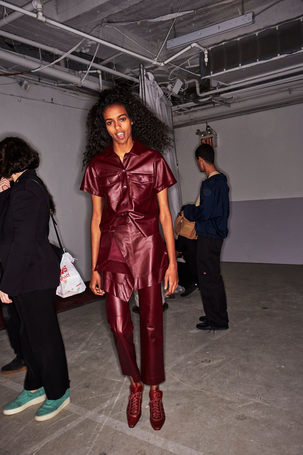 Since establishing his label three years ago, Lak — who's worked under master colorist Dries Van Noten — has saturated his garments with vibrant hues. This season, he embraced white, using the crisp color on shirting, dresses, cargo pants, skirt-suits, and more. "When you work with color a lot, it can really overtake [the garment]," he explains backstage. "This was an opportunity to focus more on texture."