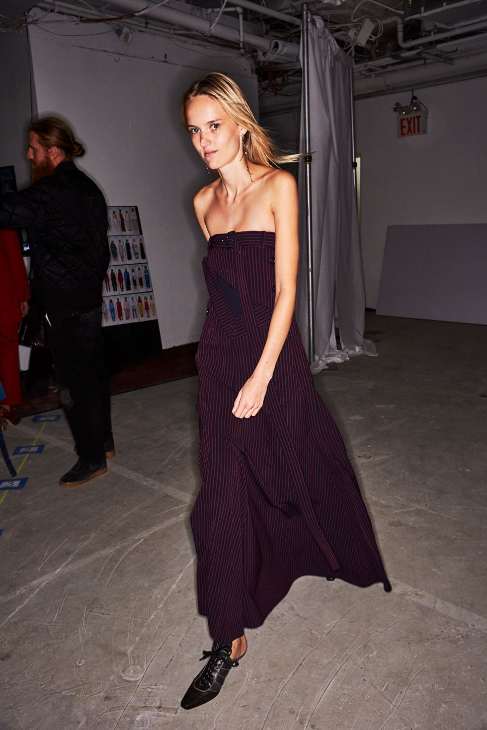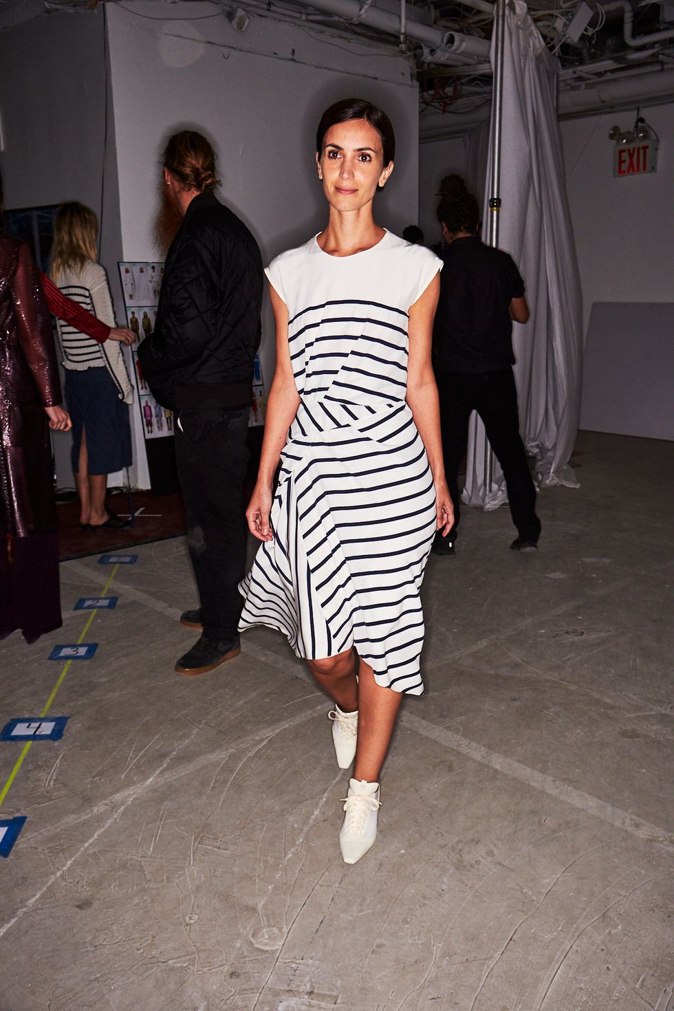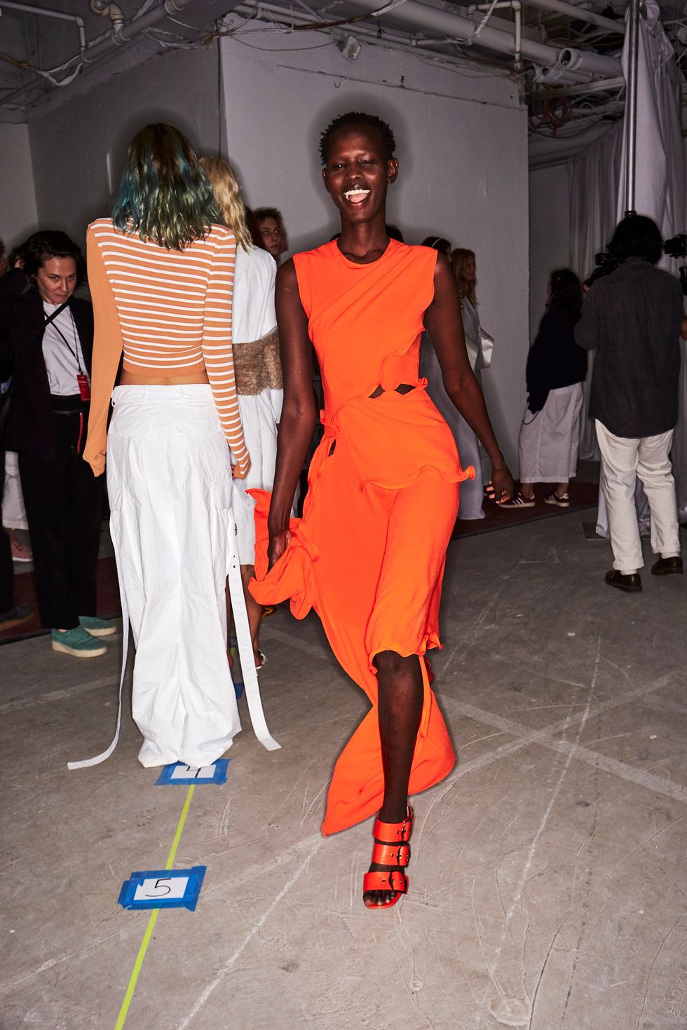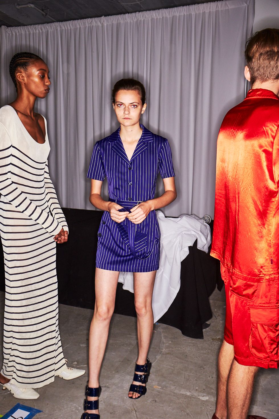 Since establishing his label three years ago, Lak — who's worked under master colorist Dries Van Noten — has saturated his garments with vibrant hues. This season, he embraced white, using the crisp color on shirting, dresses, cargo pants, skirt-suits, and more. "When you work with color a lot, it can really overtake [the garment]," he explains backstage. "This was an opportunity to focus more on texture."