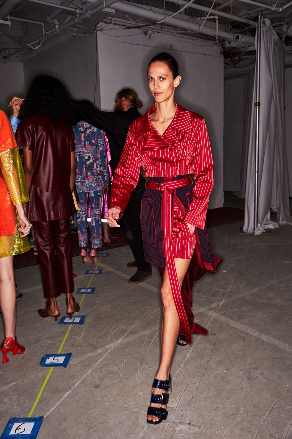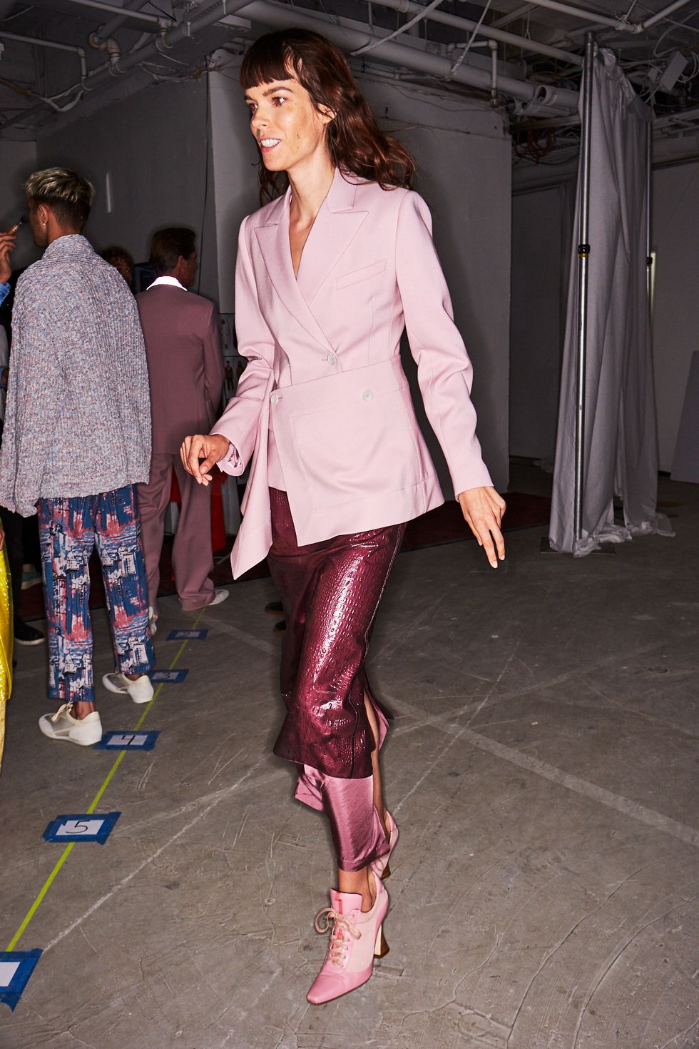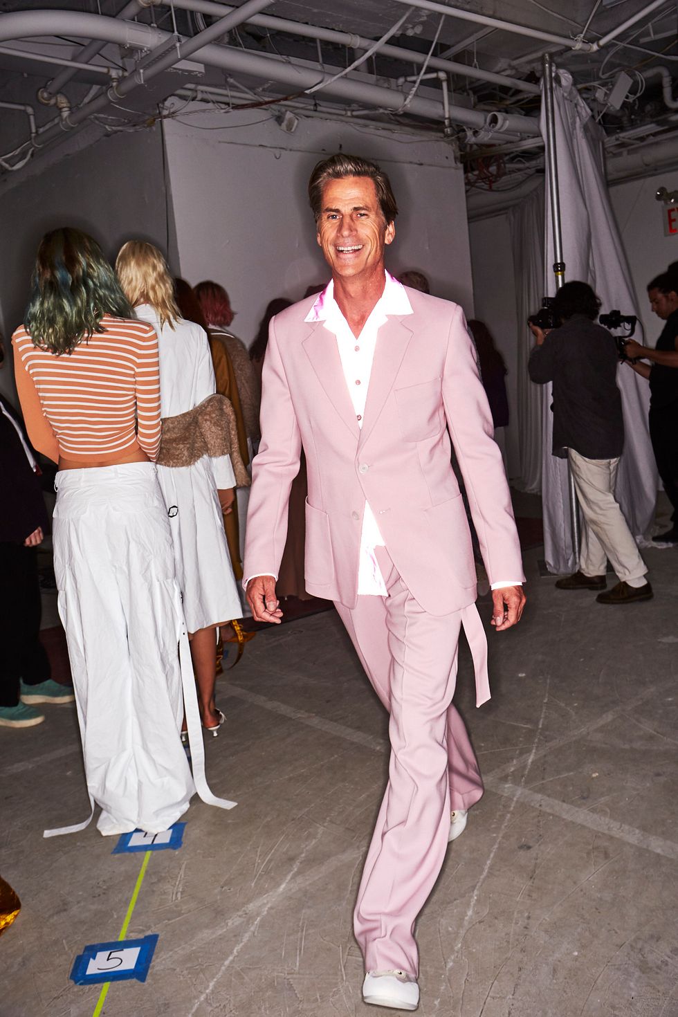 Sies Marjan creative director Sander Lak presented his spring 2019 collection above the public plaza at Lever House, a glass-box skyscraper on the corner of 53rd Street and Park Avenue in Manhattan. Models walked on a square stage installed around the second level's glass walls, and eventually circled the outdoor terrace (with umbrellas in hand to shield from the rain) which was visible overhead from inside the venue.