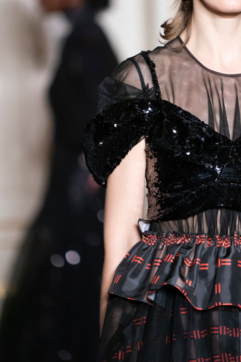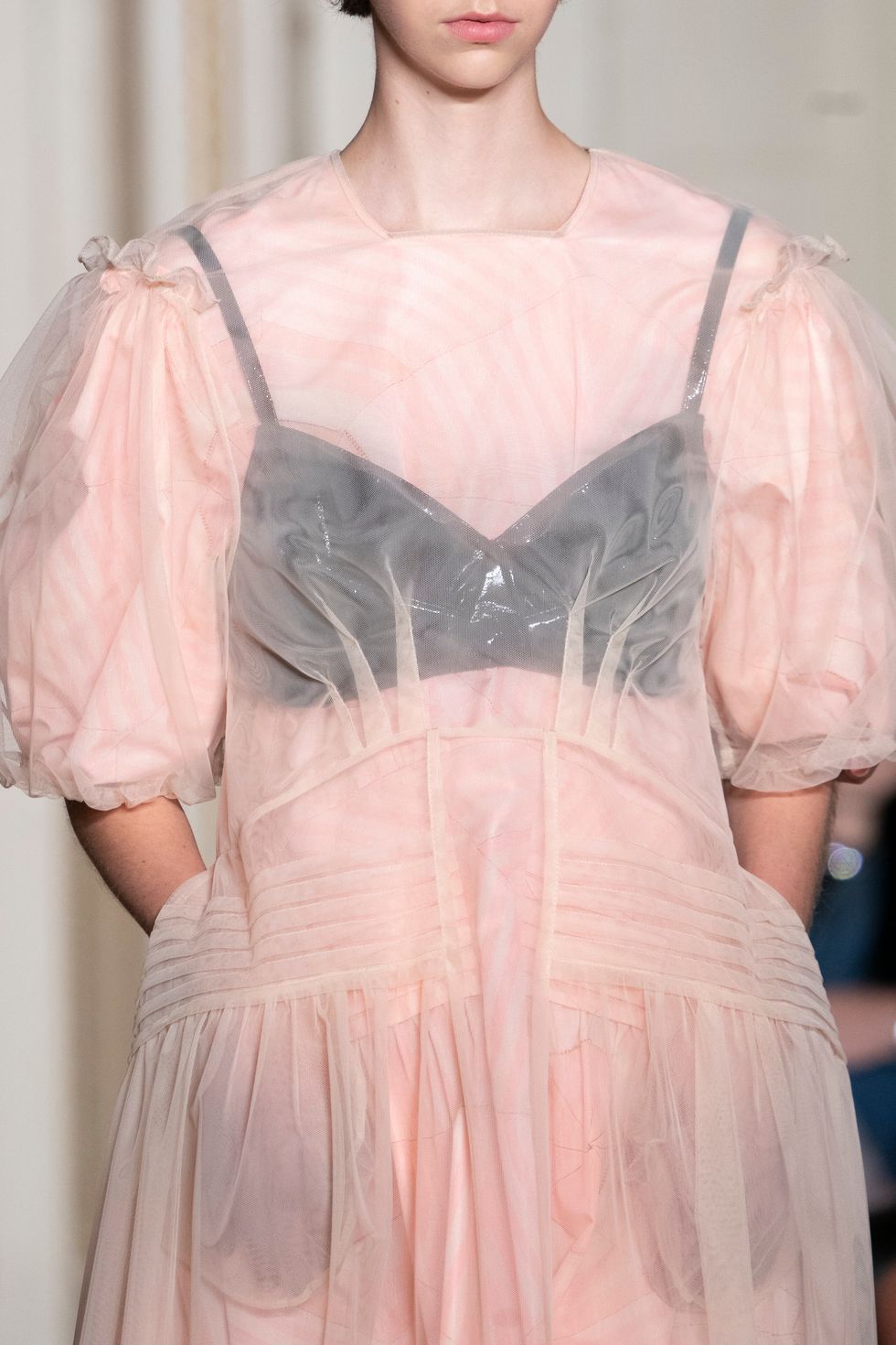 If there was one defining silhouette of the show, it would have to be the sculpted (sometimes sequined or rendered in patent leather) bustiers worn over dresses and coats — as well as under gossamer thin transparent layers. Rocha took the concepts of intimacy, privacy and femininity and transposed them into these garments.