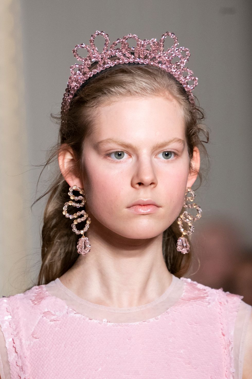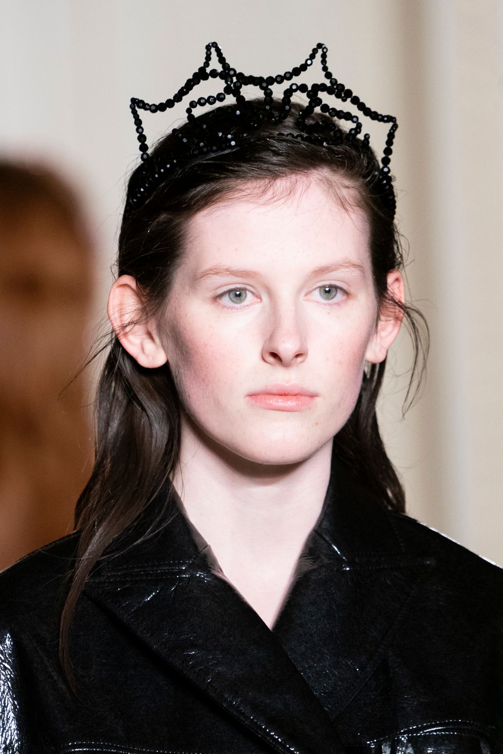 A good number of the models in this collection wore sparkling crystal tiaras. In unconventional shapes and colors (black, triangular, pearl, round and organic) these accessories added a hint of punk.