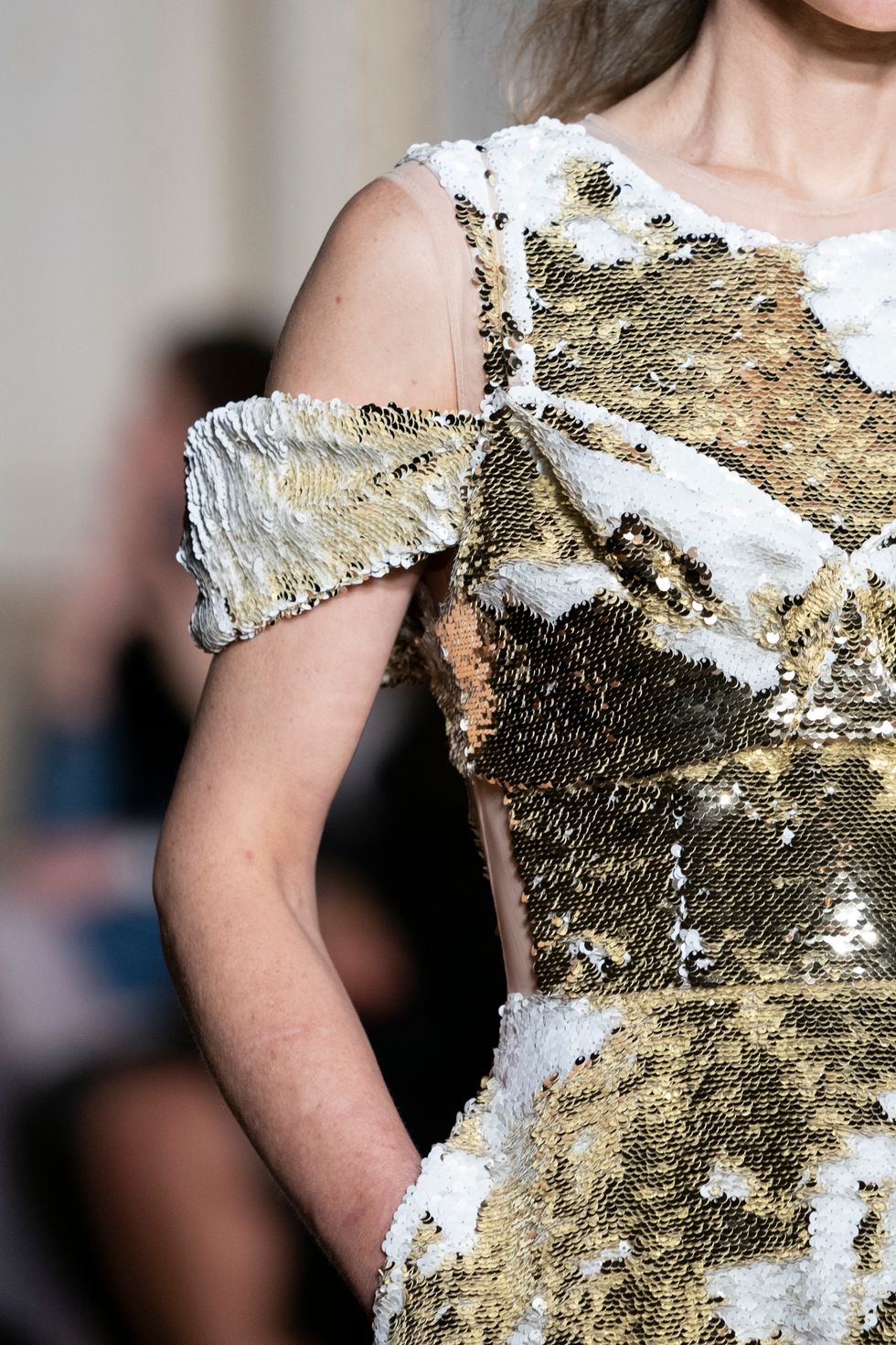 Rocha presented sequins, but in a more sophisticated way than we've previously seen this season. Dresses were covered in a smattering of gold distressed sequins as well as nearly laid out geometric shapes — creating a textural surface all their own.