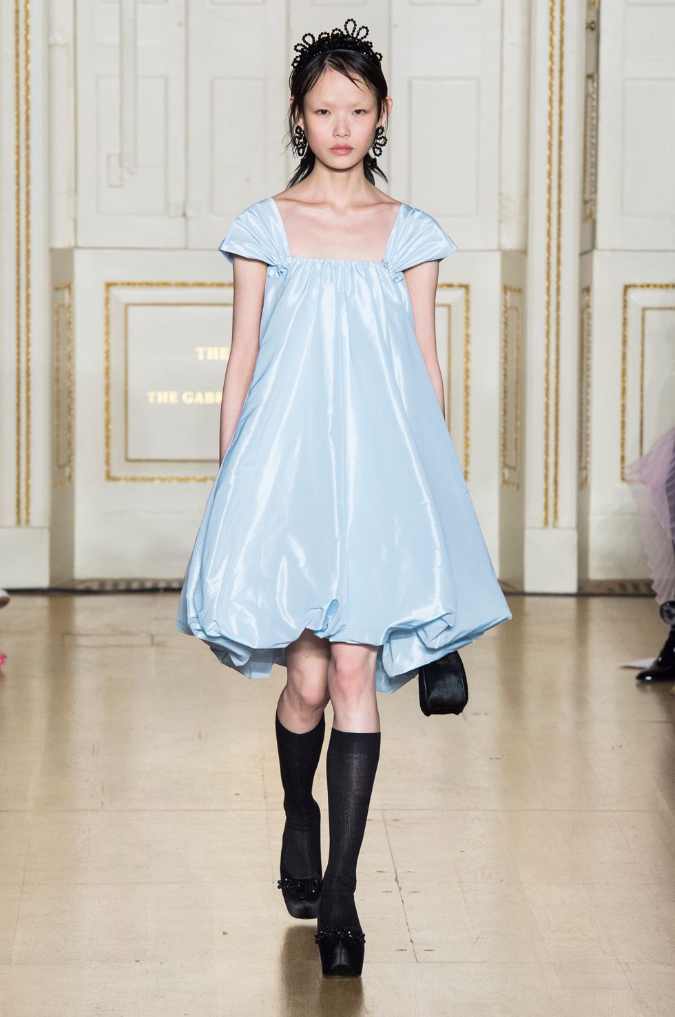 A few babydoll dresses in pastel colors went down the runway. Paired with translucent knee socks, platforms and tiaras these pieces have off a distinctly '90s girly grunge vibe.