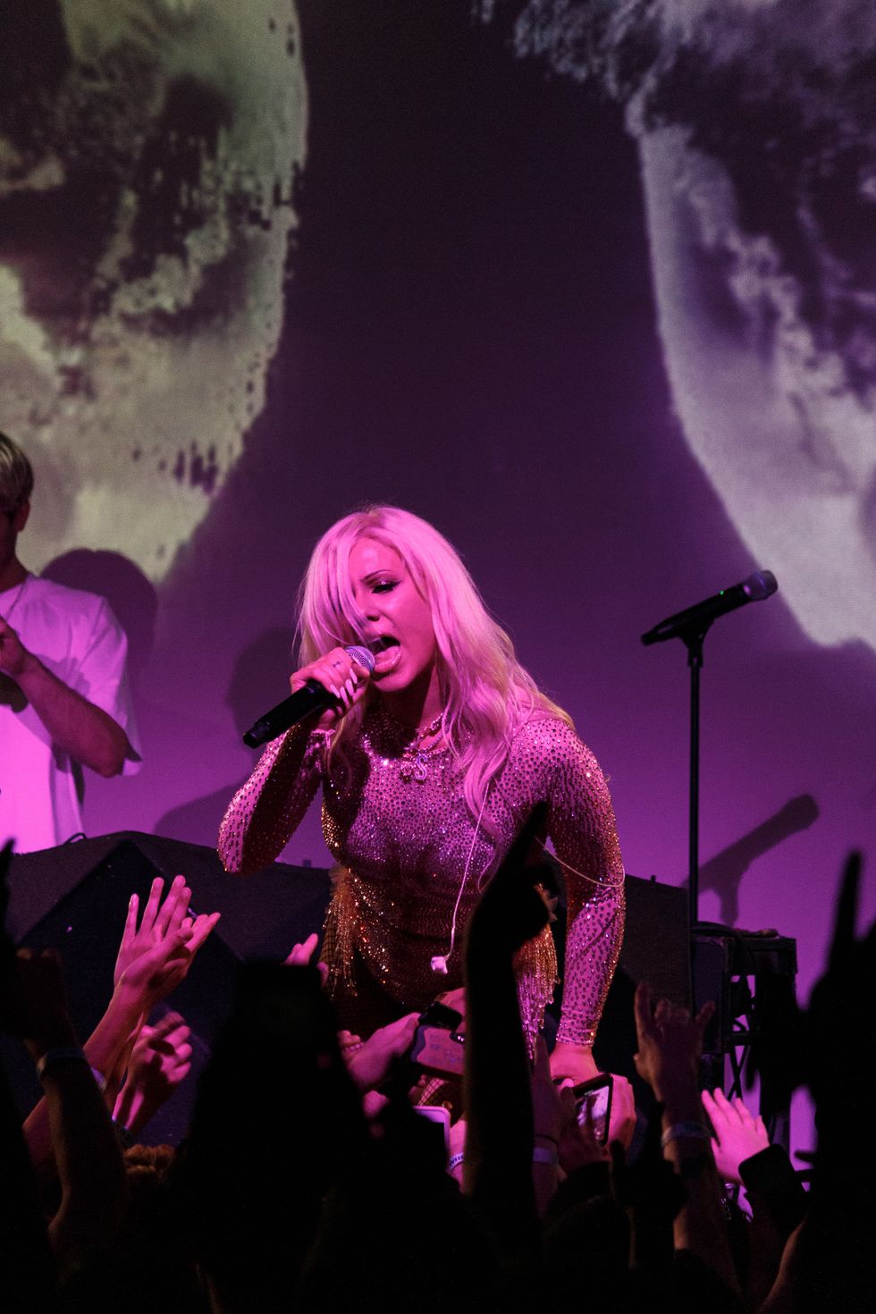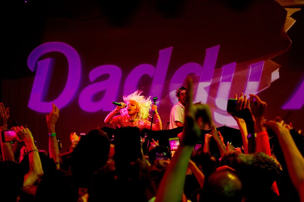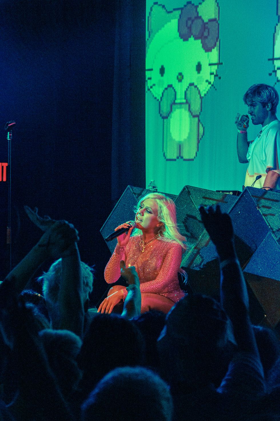 So when Slayyyter finally hit the stage shortly after 10:30 PM, one couldn't help but wonder if all the hype and cred she's been building would translate onstage. She stepped out with long, blonde tresses styled with an iconic Farrah Fawcett flip in the front, wearing a pink metallic, sequined bodysuit, not unlike something possibly worn by her idol and closest inspiration, Britney Spears. Up until that reveal, many fans, who had only seen Slayyyter online, didn't really know what she looked like.