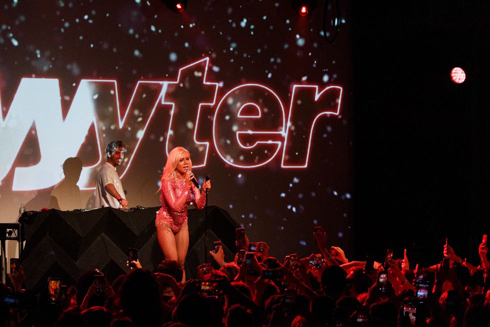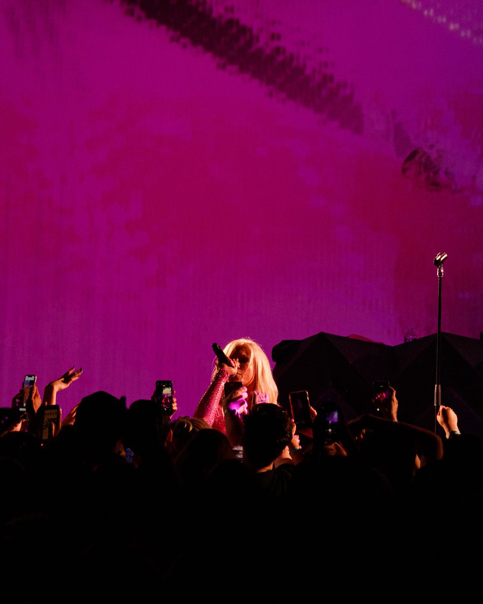 Unlike Britney, who opts for a headset for her lip-sync, Slayyyter rocked a handheld mic, delivering a mix of pre-recorded and live vocals. She gleefully sauntered about the stage, performing all 10 of her singles released from last year to now. She signed every autograph, collected numerous gifts, and took fans' phones for selfies. Slayyyter also sang a mix of new, as-yet-unreleased singles from her upcoming album, which she referred to as S1 onstage. One track covered vain celebrity with a deep-fried Britney vocal so spot-on it was chilling. Another half-rapped, half-sung track with a "cha-ching" refrain recalled Gwen Stefani at her most delightfully weird, mid-2000s peak. (Stefani is another of Slayyyter's key inspirations).