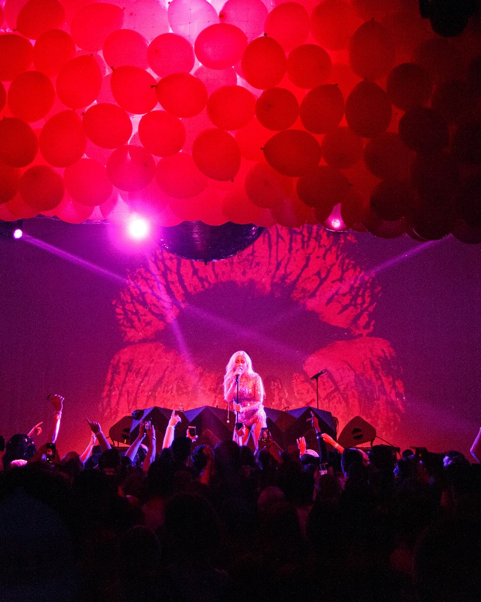 Trippy visuals reminiscent of Slayyyter's single artwork by Glitchmood, lit up the screen behind her and Robokid, who was cueing up the instrumentals. There were light shows, jumping, and an encore of "Mine" with pink balloons that descended upon the crowd only to be popped like fireworks.