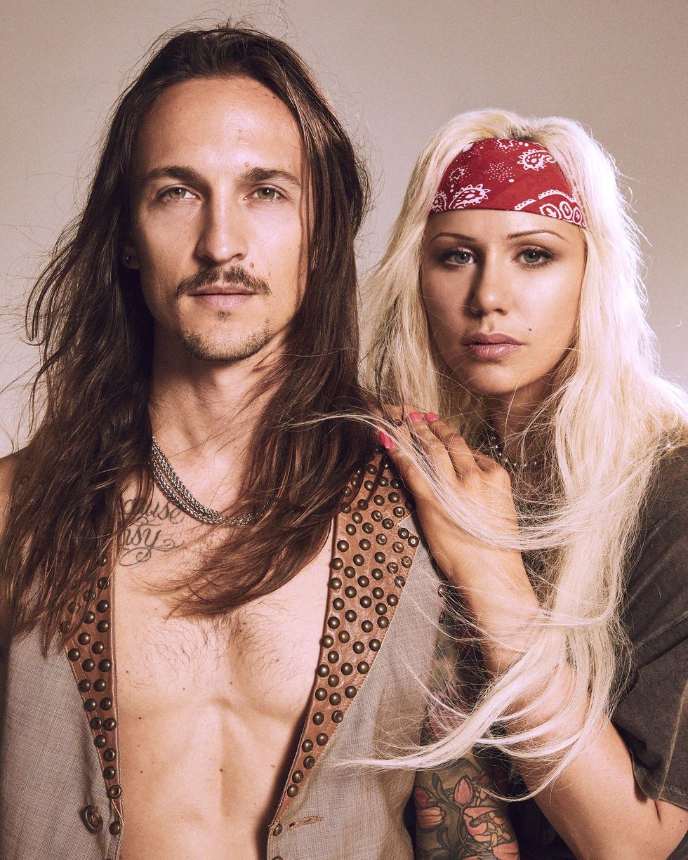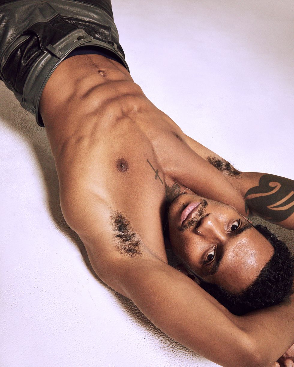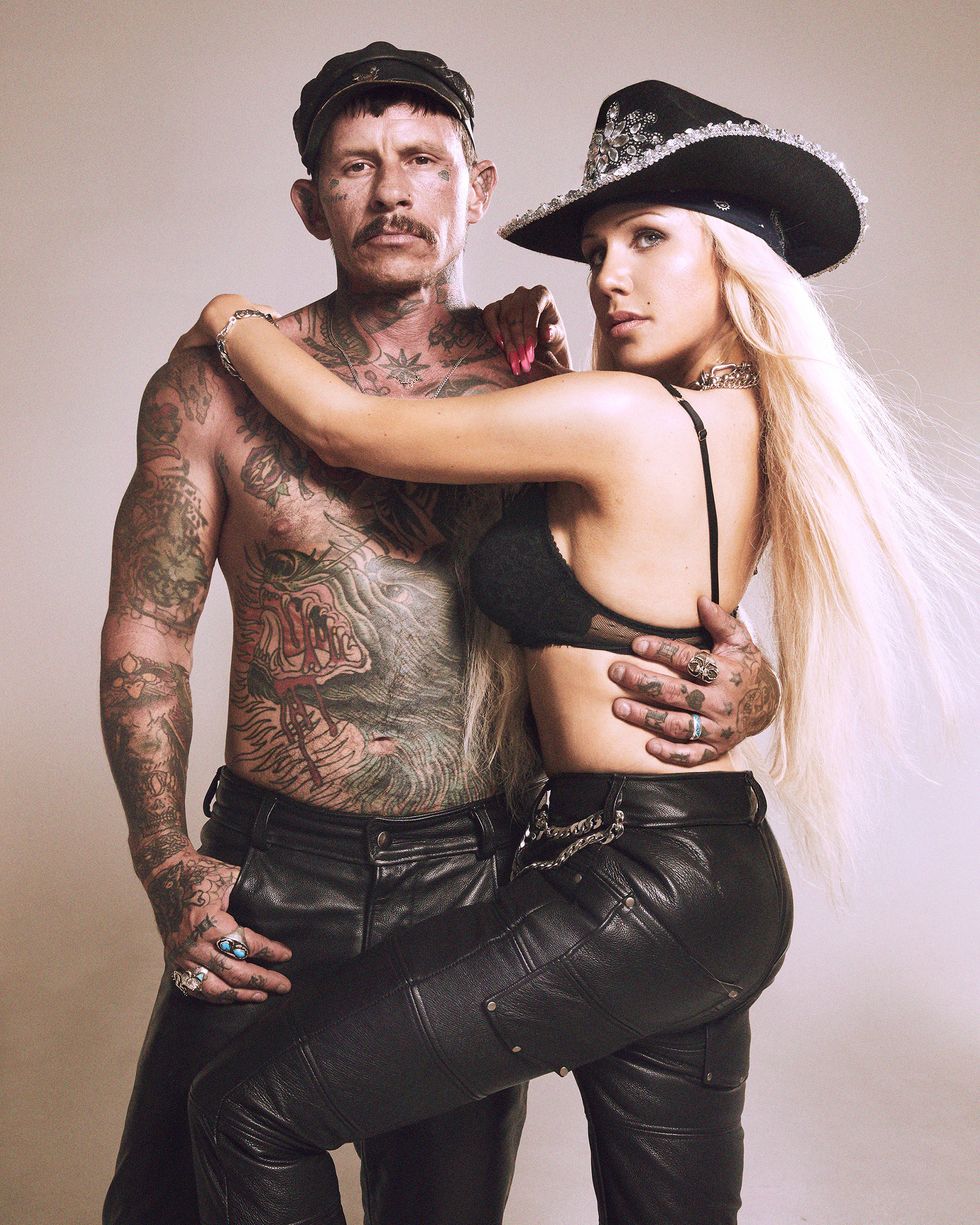 Now, Slayyyter is on her knees for her final shot of the day. She's wearing a bandana, a denim mini skirt and leather accessories. "You're Bret Aguilera," photographer Oscar Ouk shouts playfully, cross-referencing both Christina Aguilera's iconic Stripped era, and Rock of Love's Bret Michaels, which is the main inspiration for this shoot. Slayyyter jams her thumbs into her waistband and looks coyly at the camera. A wind-machine just feet away blows her extensions into her face.