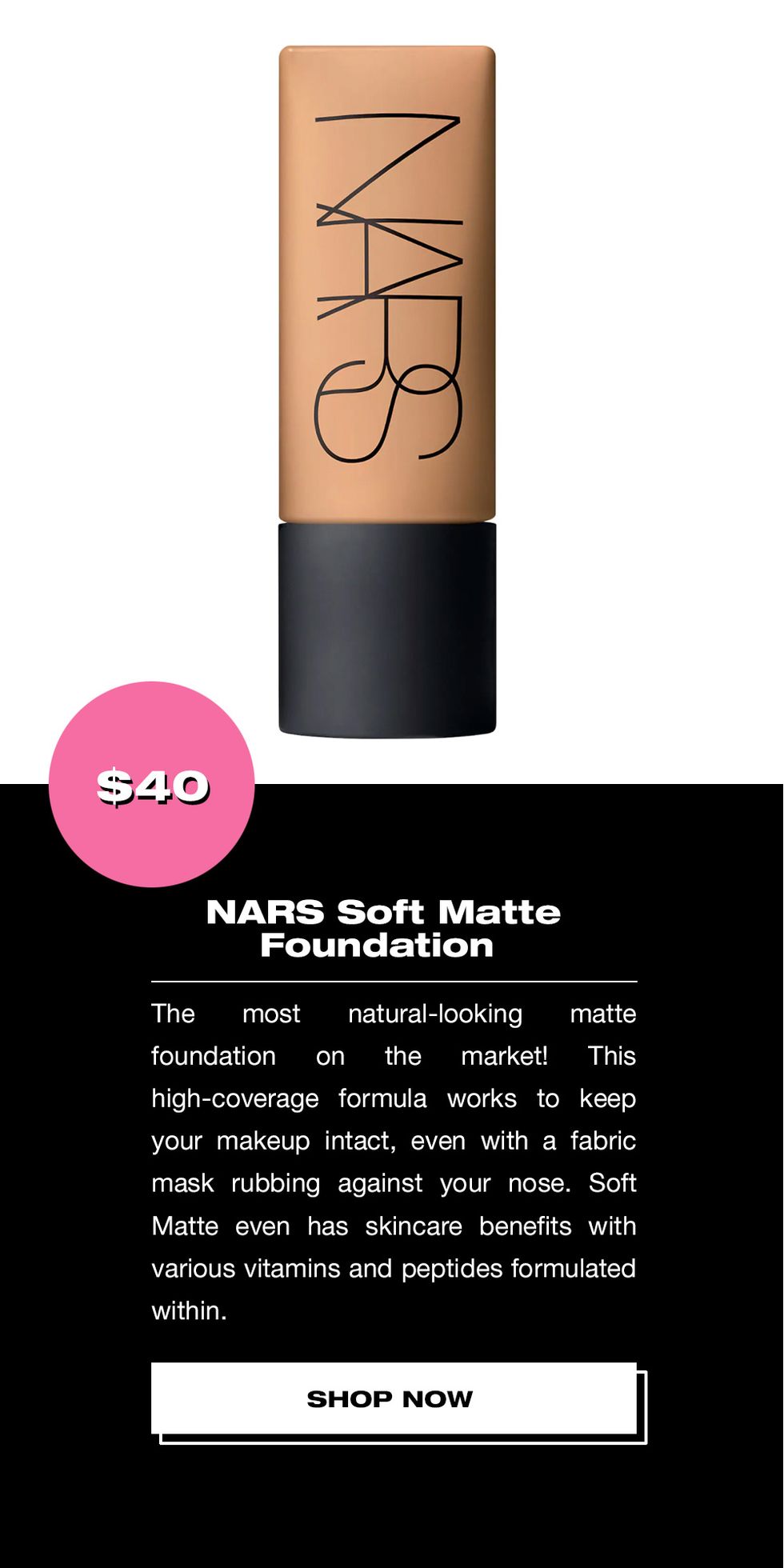 Finally, the real star of the show is the new NARS Soft Matte foundation, which is perfectly formulated for wearing masks. The diffusing powders in this foundation absorb sebum, which prevents the color from oxidizing and allows it to remain transfer-resistant.