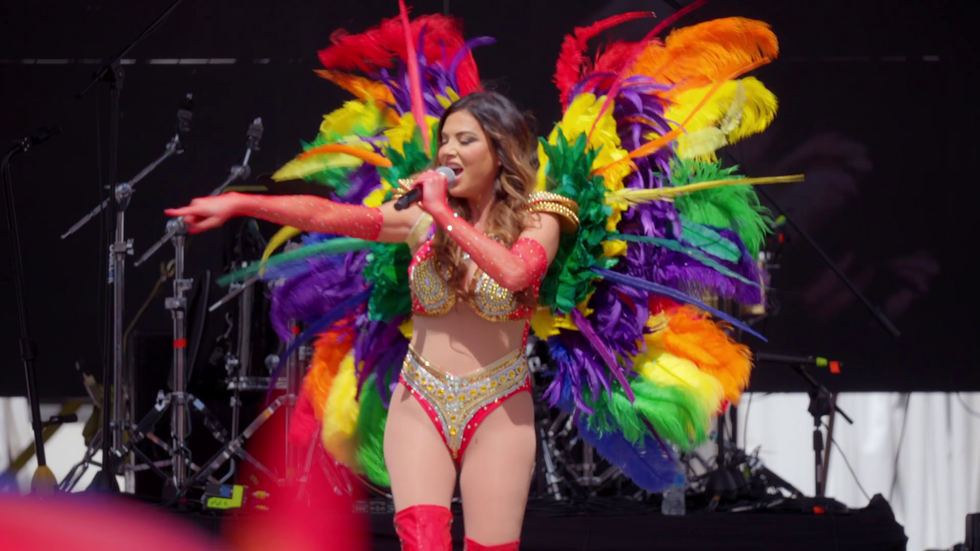 Gay icon Adriana performed her bubbling under single “FYAH” at Mexico City Pride. The look is right, the song is right, even the lipsync track was right! She has all the makings of someone who shows up halfway through the Pride mainstage to lipsync a song you’ve never heard. She’s even got the classic rainbow feather wings to match!