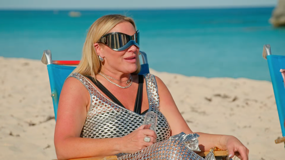 Patient zero for Ridiculous Outfit Disease is Miss Heather Gay right here. What did she bring with her on a Bermudian beach getaway? This odd cutout thing and sunglasses that make her look like a tucked away extra in the Blade Runner reboot. She’s doing body rolls in the club on future molly with a cyborg, where she wishes for death every single day after her shift at the I Don’t Give a Fuck factory.