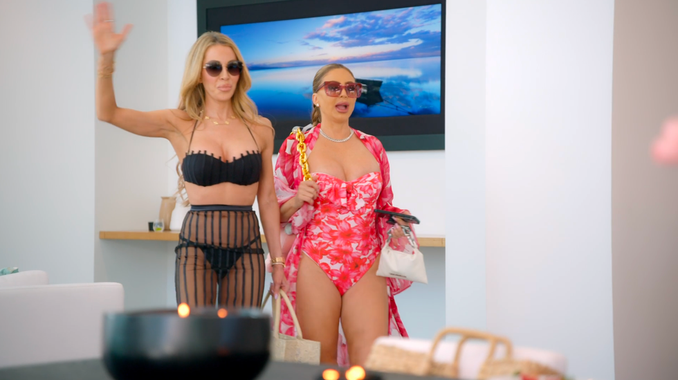That said, I did laugh horrifically loud that the conversation above is about whether or not Angie is in the Greek mafia. I’m sure it’s ridiculous hearsay propagated by Dennis the Menace (Meredith Marks). That said, I’m not sure she’s beating the allegations that she’s Greek Carmella Soprano when she shows up in Versace print bikinis and glasses larger than the human skull.