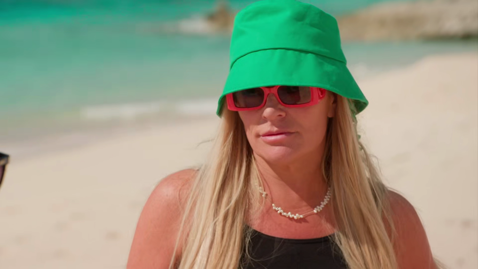 Triumphant after her defeat of Meredith Marks last week, Angie descended on a Bermudian yacht wearing this fantastic mesh ensemble and another pair of ridiculously chic shield glasses. She’s like if Ariel from The Little Mermaid sprouted legs and discovered self tanner and wig install tutorials on Youtube.