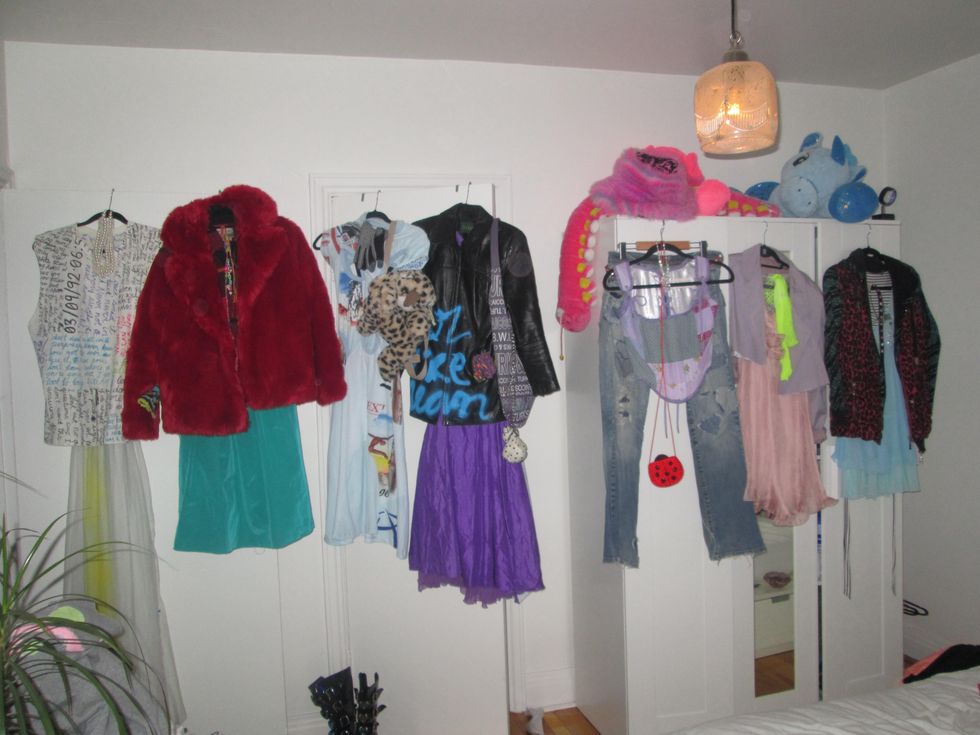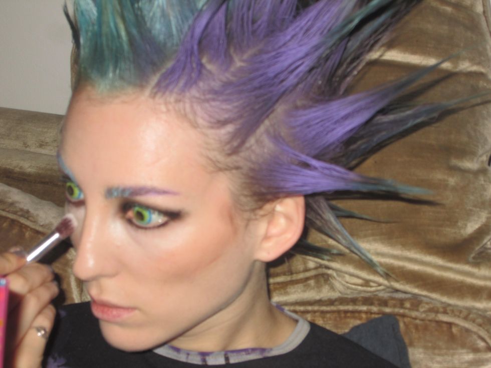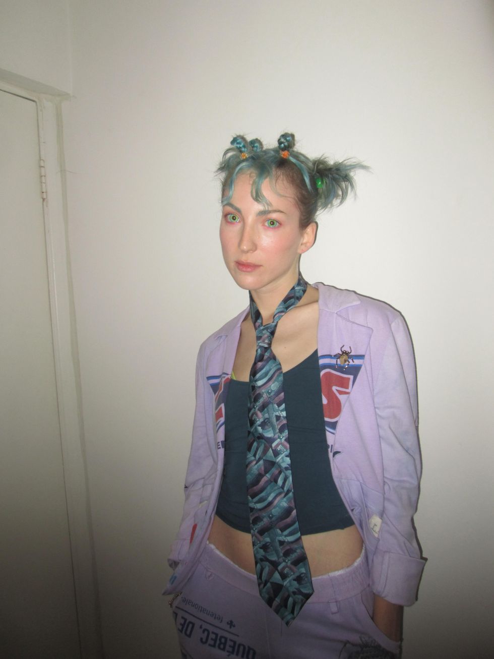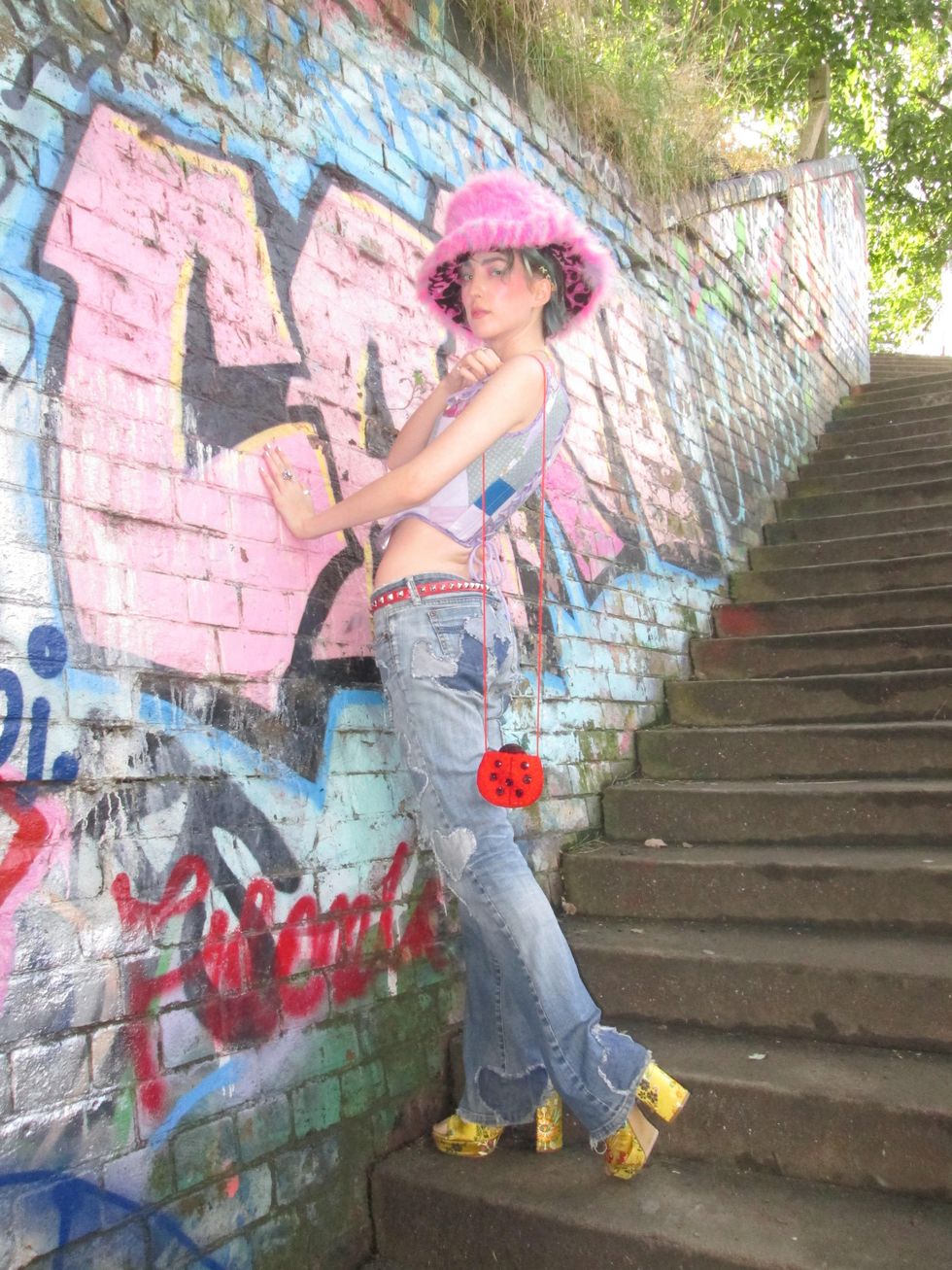 The styling reflects Bel's playful approach to fashion, with tons of outfit changes that are as deeply personal as the lyrics she sings on "2AM." One look layers a mint baby doll dress over a striped shirt with matching knit cardigan; in another, Bel throws on a giant furry pink hat and corset with low-rise patchwork jeans. The hair throughout goes from cyberpunk buns to monstrous spikes, all largely pulling influence from Japanese street style and designers who're close friends.