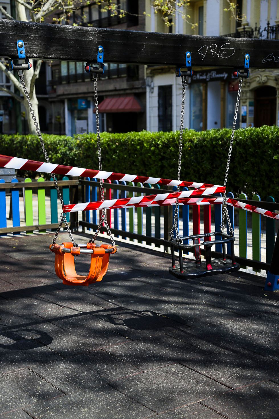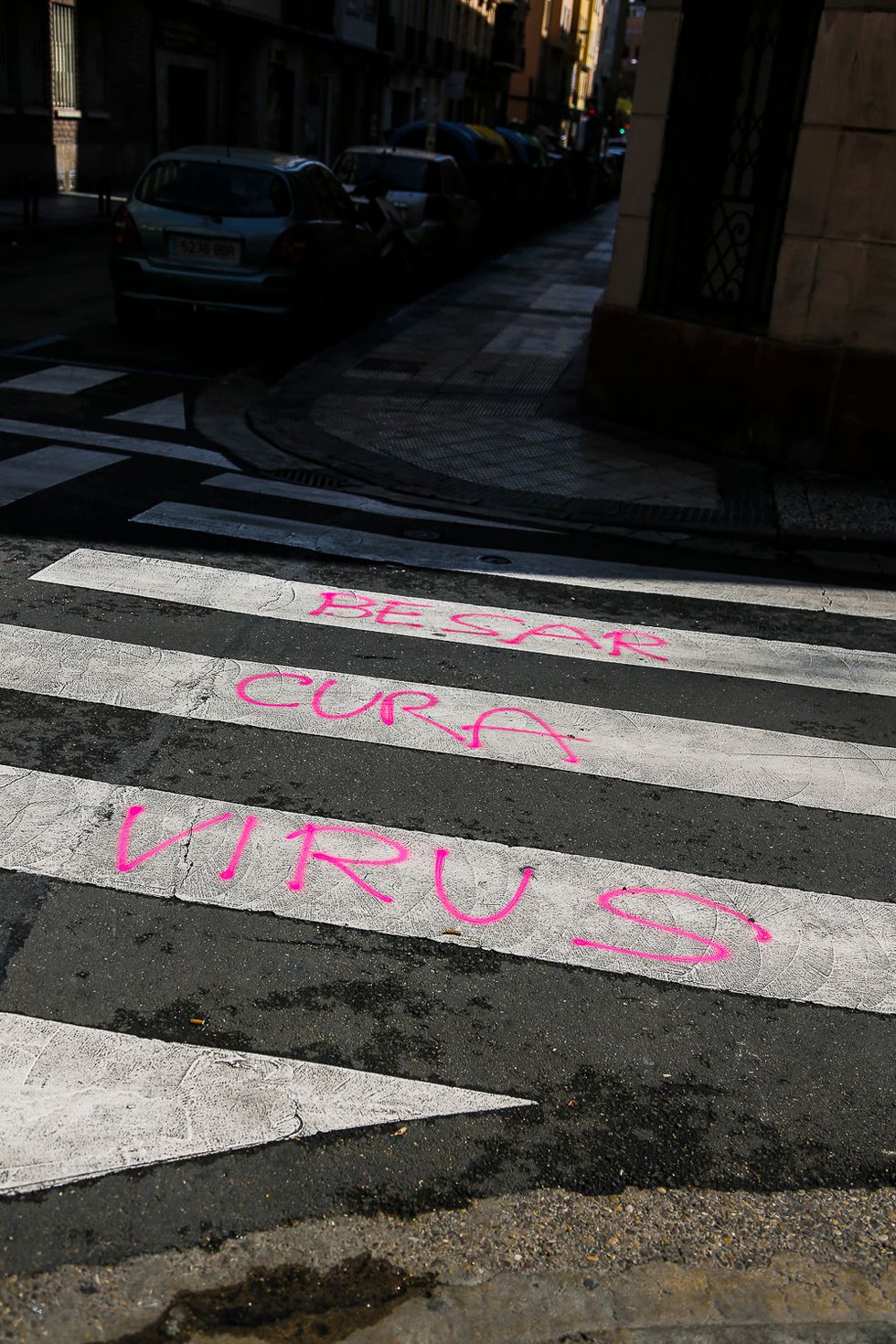 The morning after we had sat in front of the TV hearing President Sánchez announce Spain's official lockdown, my sister and I decided to take in "one last walk" around the city while we still could. Right as we hit our corner, the one on Calle Héroes del Silencio, aptly named after Zaragoza's hometown rock band, we saw the romantic, optimistic, hot pink tag: "Besar Cura Virus." Kissing cures viruses. This was the first lockdown image I took, no diary in mind. Only a few days ago did I find out the artists behind the tag were my neighbors, a couple named Nacho and Laura. Two weeks prior to lockdown they had gone camping and found most of the forest run down for timber. Hidden behind a stump they found a pink spray can used to mark trees ready to be cut down,and brought it back to the city to write their message on the block.
