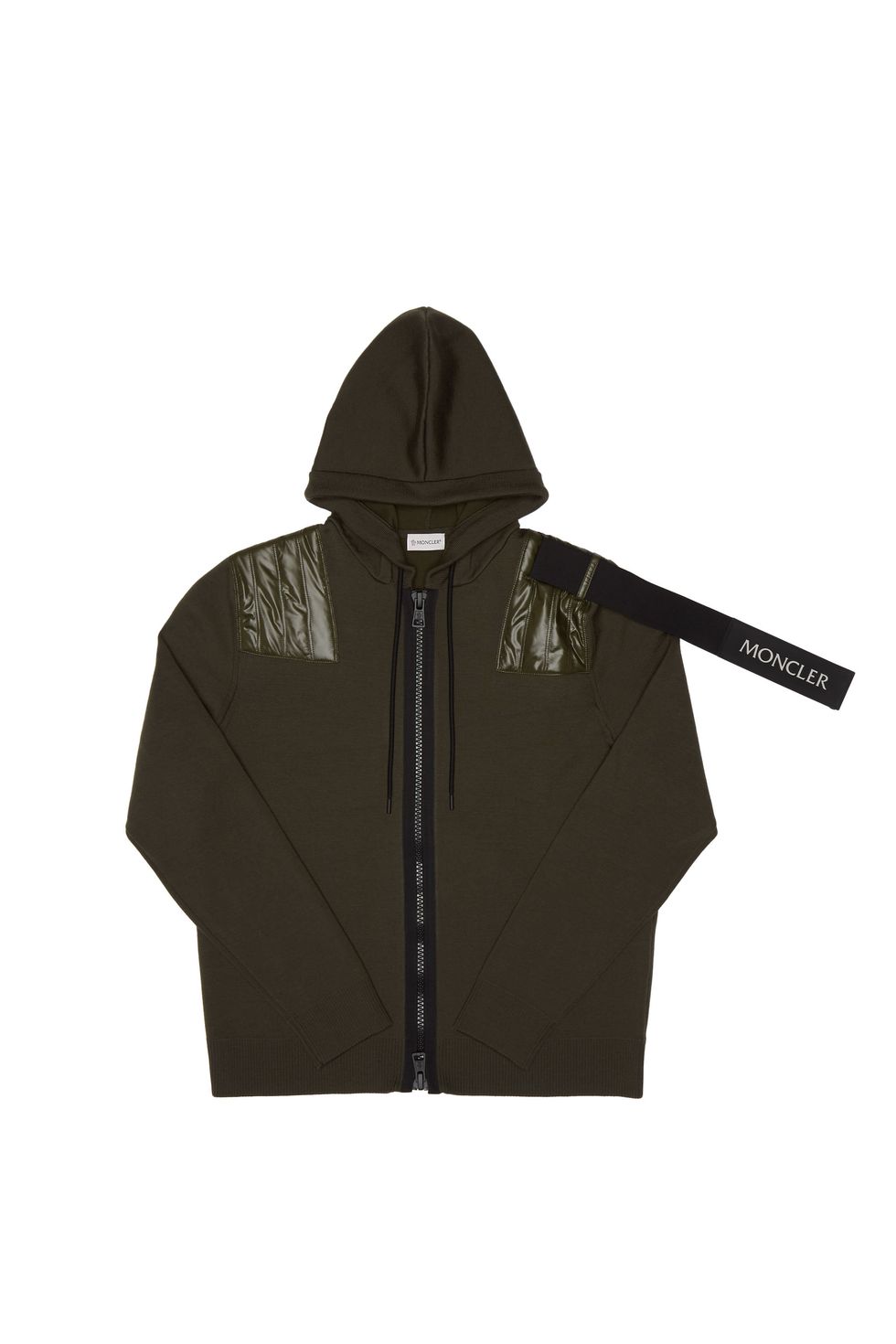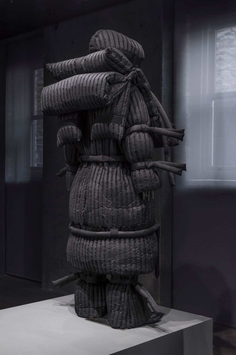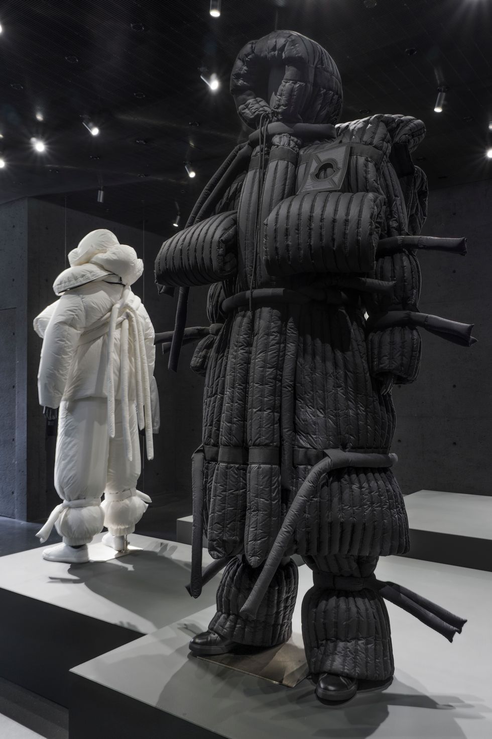 Displayed on mechanical sculptures by London-based design studio Isabel + Helen, Green's original designs combine his survivalist aesthetic and Moncler'scharacteristicluxe utility. These quilted, down garments made with tech-materials and covered in exposed stitching, are surrounded by similar, more saleable pieces (jackets, hoodies, trousers, and shirts) that range from $360 to $1,925.