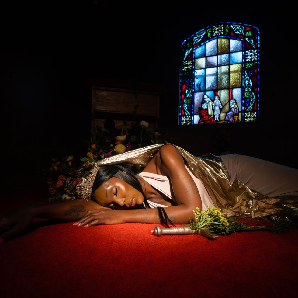 For Amerasu’s single and album art, photographed by Kyle Thompson, she’s presented as a classic princess, looking down upon a kneeling man painted entirely in silver; another image shows Amerasu alone on the ground, eyes peacefully closed, with religious stained glass lit up behind her.