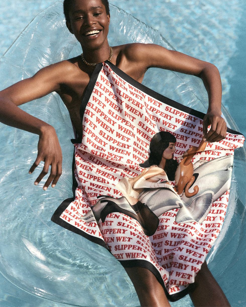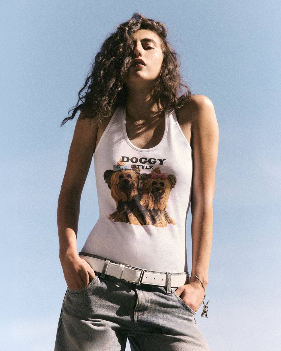 Amelia Gray is spokesmodel for the collection, wearing a t-shirt that first appeared on the runway of McCartney’s Winter 2025 runway show. The tee combines Koons’ "Untitled (Girl With Dolphin and Monkey)" with the slogan "Slippery When Wet," a throwback to Stella’s debut collection in 2001. So, you’re not just getting stylish apparel — you’re getting a wearable retrospective of some of both creative’s greatest hits. There are tanks, a t-shirt and a hoodie in organic cotton, a chunky turtleneck in RSW-certified wool and doggy style bags each available for a limited time.