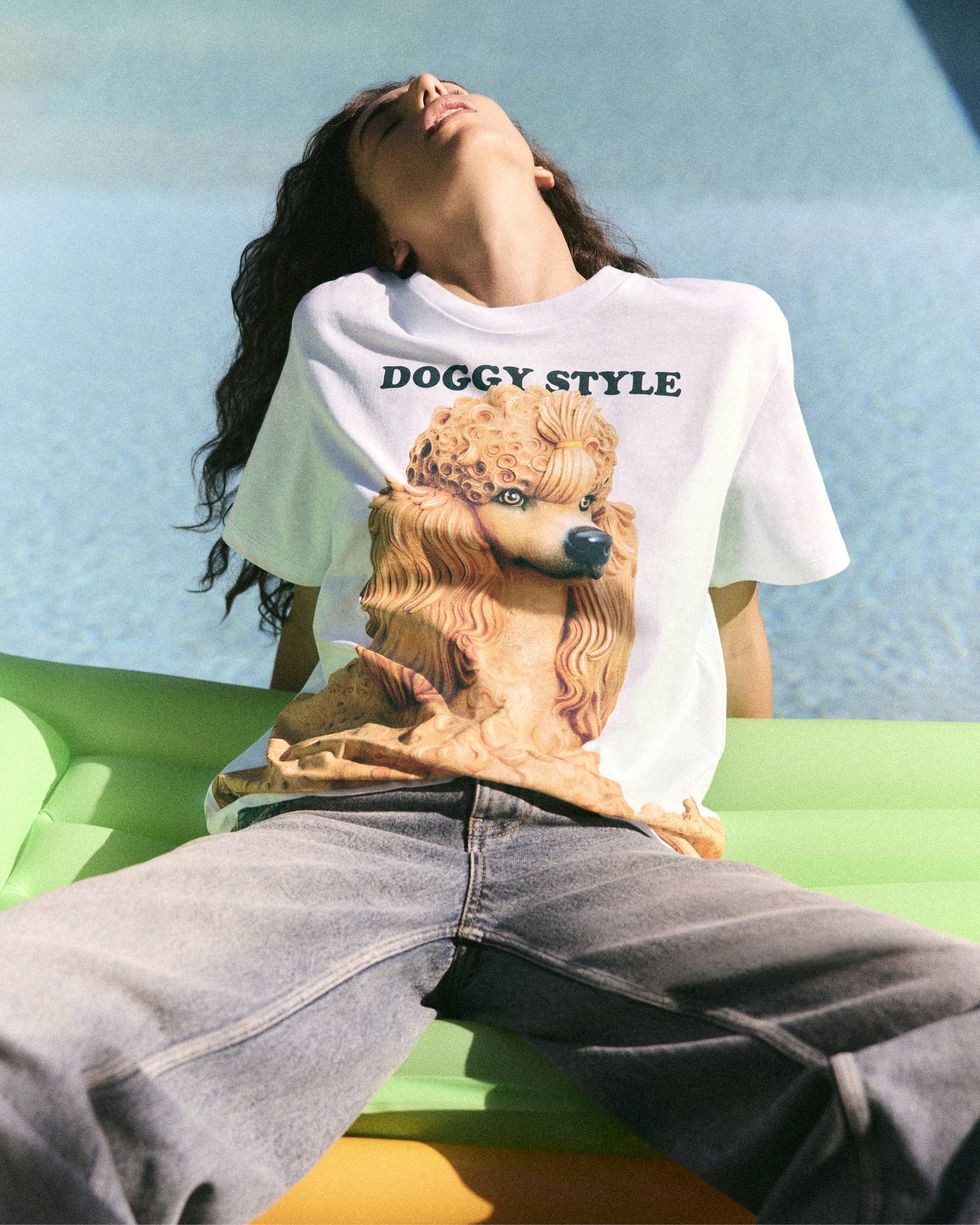 Not only are they both superstars in their fields, they’re friends and collaborators. They have a new capsule collection launching today, January 26, featuring apparel emblazoned with drawings of Koons' poodle and Yorkshire terrier sculptures and a tongue-in-cheek Doggy Style logo. The canine artwork is from Koons' 1991 Made in Heaven series.