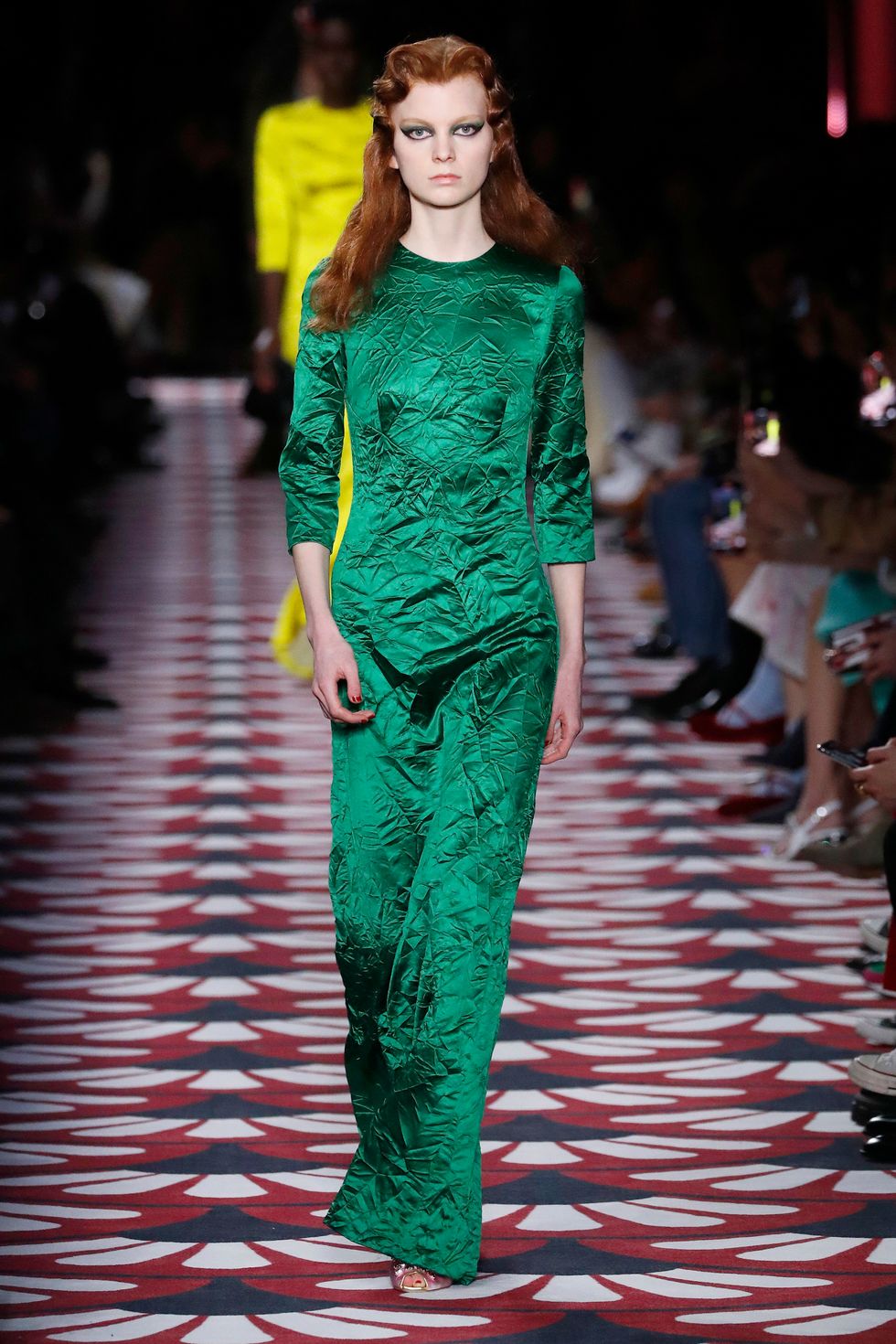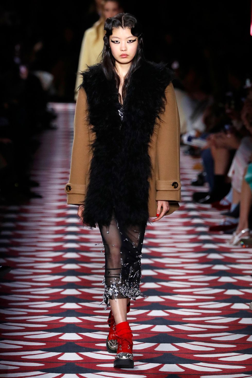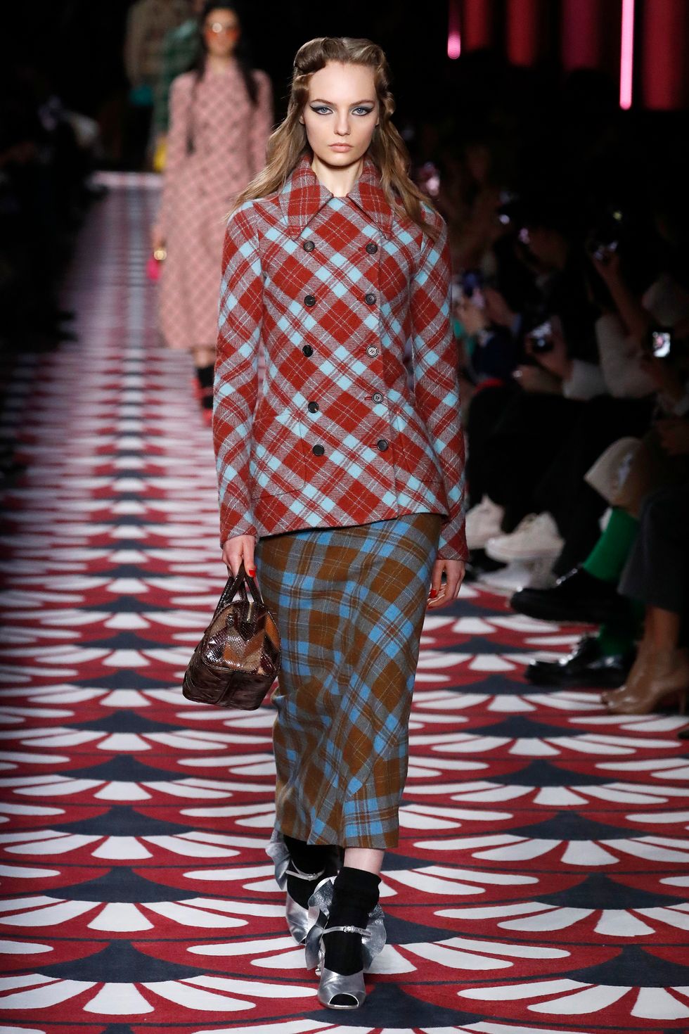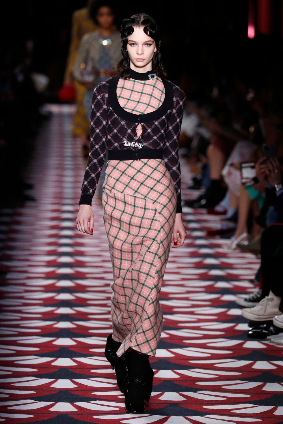 The rest of the looks featured more of the colorful crinkled satin, flowy duster coats, sheer embroidered skirts and padded plaid jackets. Overseen by Miuccia Prada, the brand will continue to be designed by its founder while the Prada label will make its debut under both Raf Simons and Miuccia in September. See, below, for more photos from Miu Miu Fall 2020.