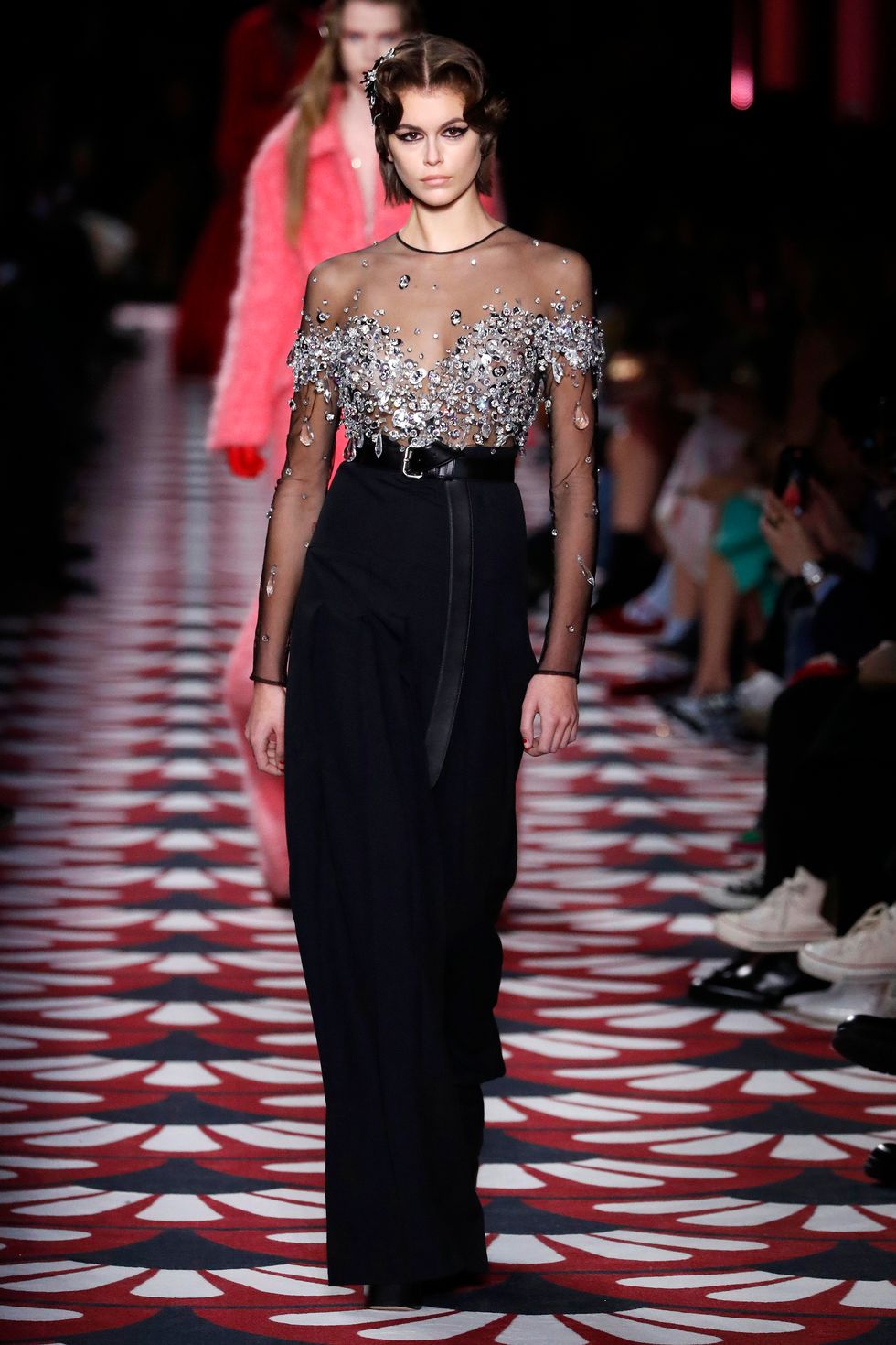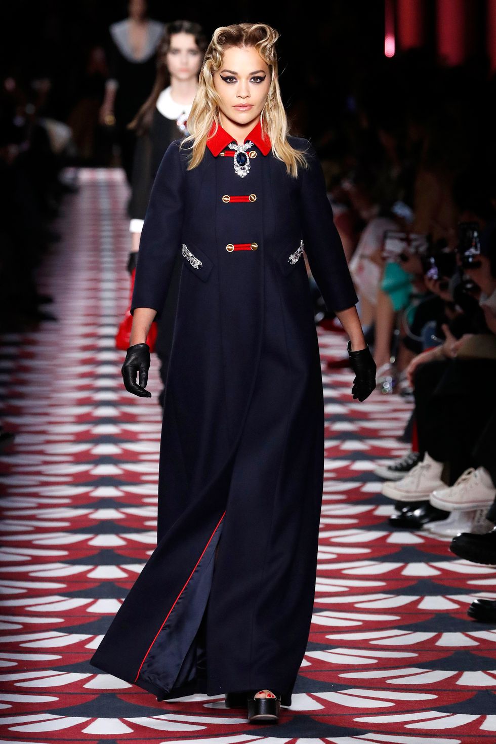 Reid, 16, wore a crinkled satin orange floor-length dress under a long blue coat while sporting winged eyeliner and a brooch on her hair. Rita Ora also made a surprise appearance on the runway in a navy and red coat, though she's previously walked for brands like DKNY and Moschino.