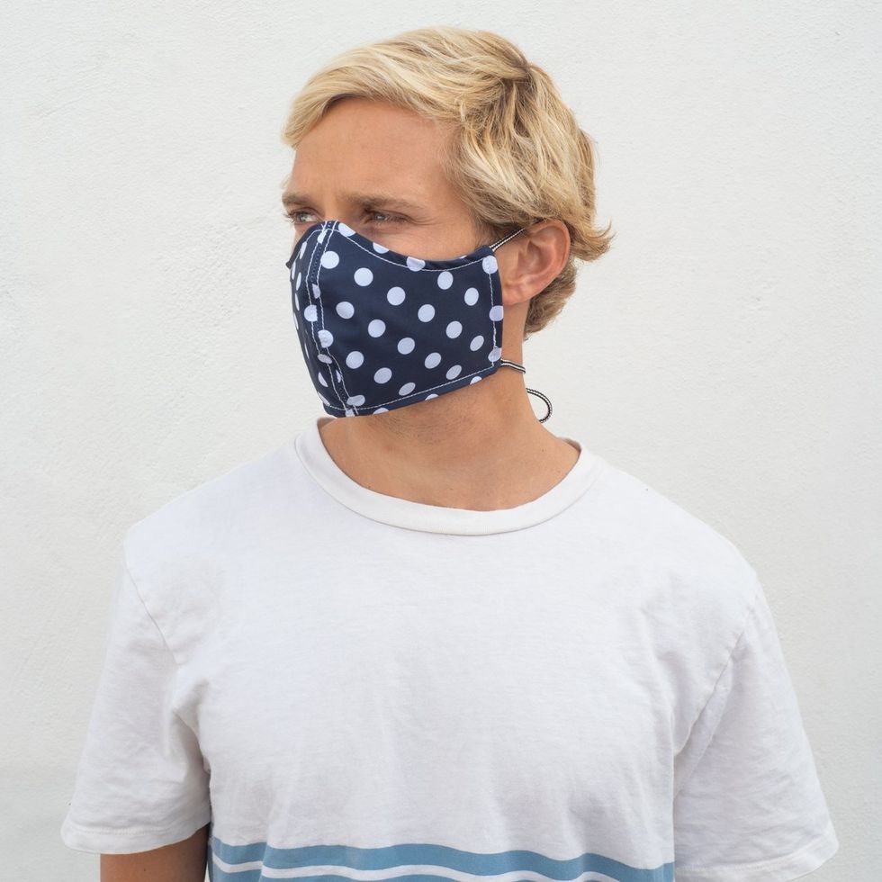 Reversible polka-dot mask. For each one you purchase, a mask will be donated to CORE, a non-profit that provide free drive-through testing for high-risk individuals.