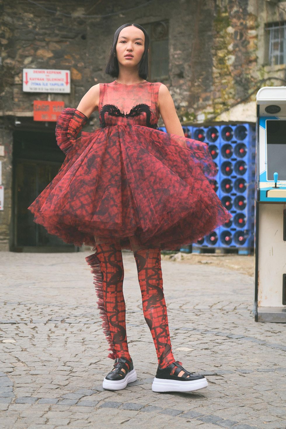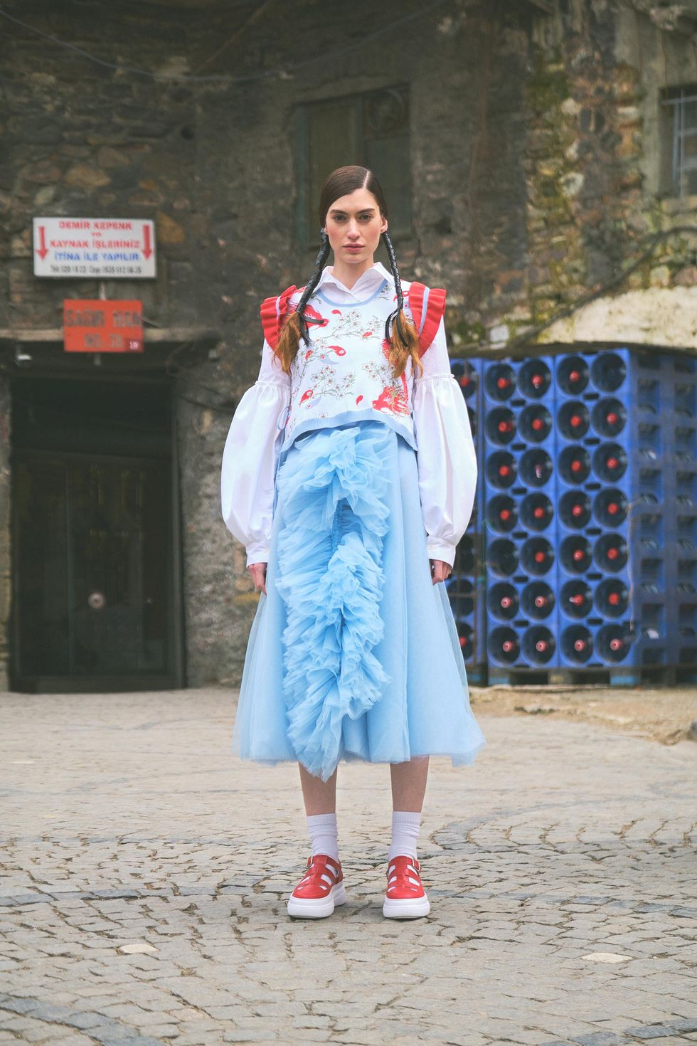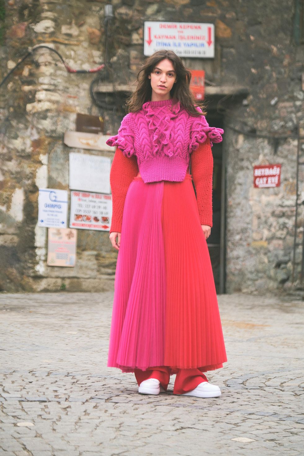 This land has endless materials to offer for creative minds. It is really east of the west, west of the east... As a local designer, I believe that we are obliged to bring the special muses in Turkey to a global audience. I would like to explain this with our fashion show performances, for example "Çiçek Pasajı" and "Unkapanı Plakçılar Çarşısı" are two venues that directly show two different structures in Istanbul. One of the Late Ottoman Period, a Western influence, and the other is the symbol of the production power in modern Turkey. This completes the perfect silhouette on our design process. The color palette, patterns and textures of the collections – even though it's feminine – are very suitable for the intricate with a reference to genderlessness.
