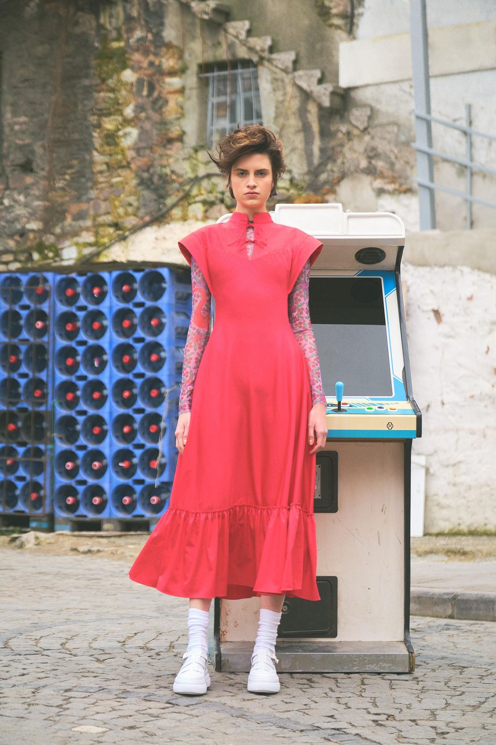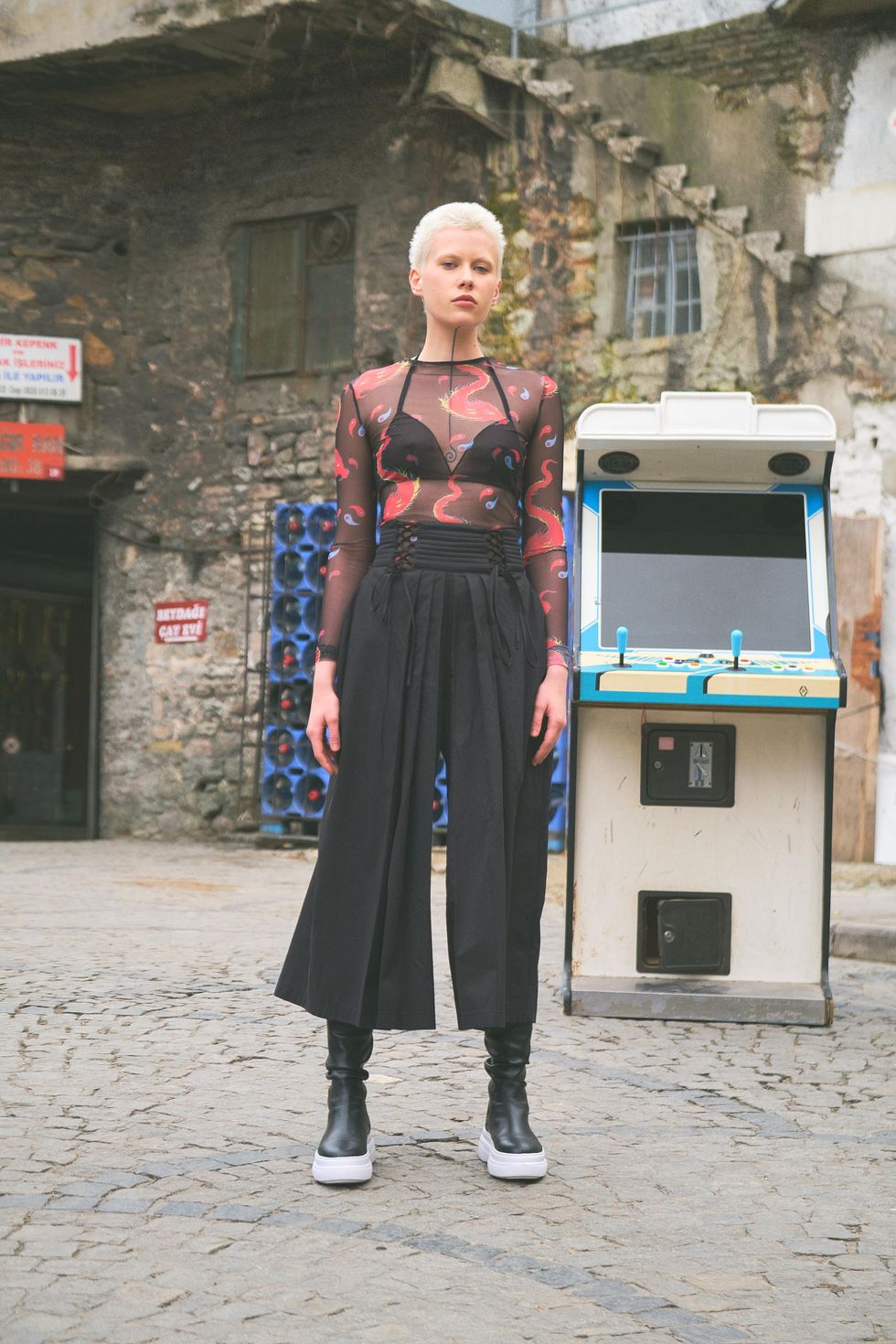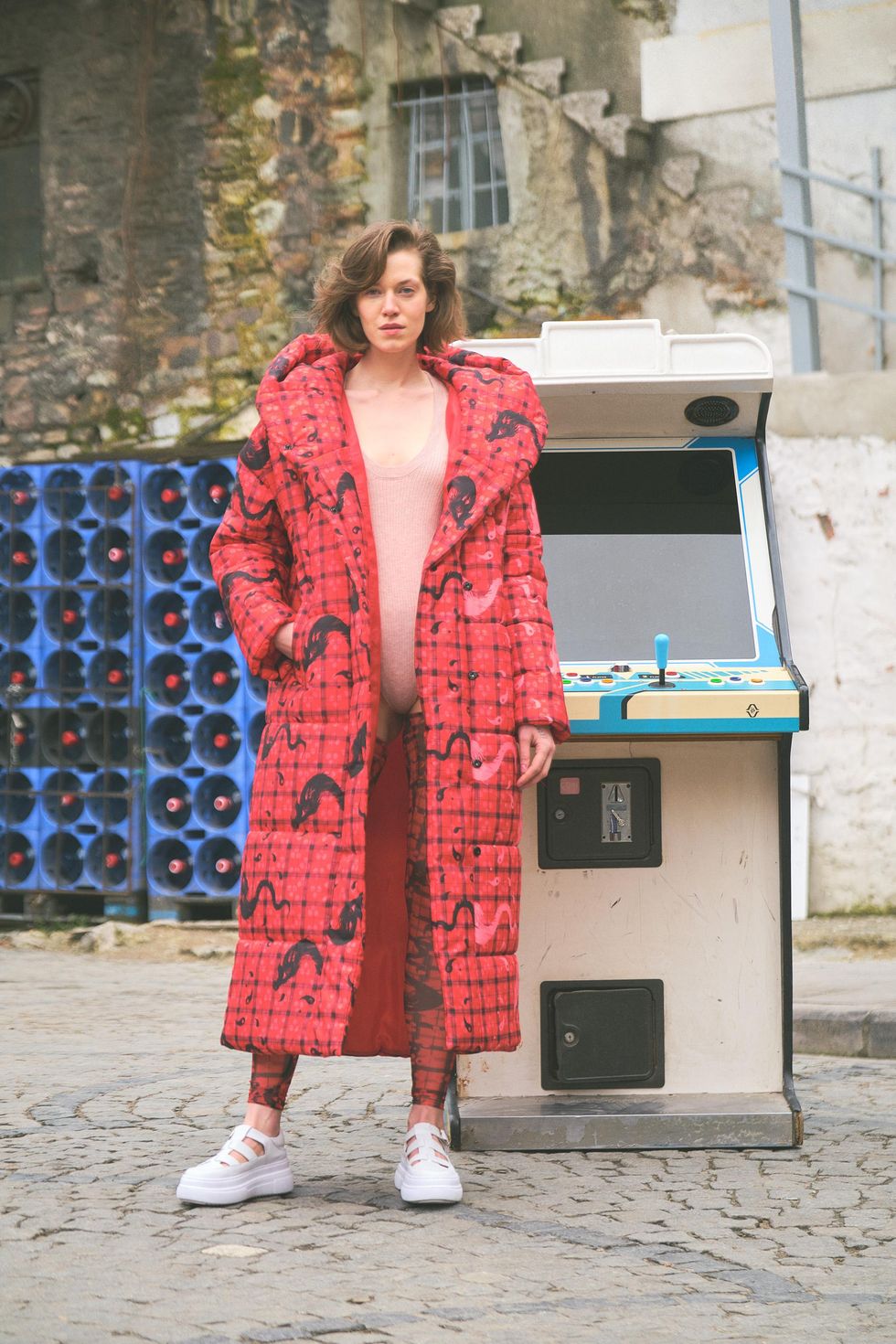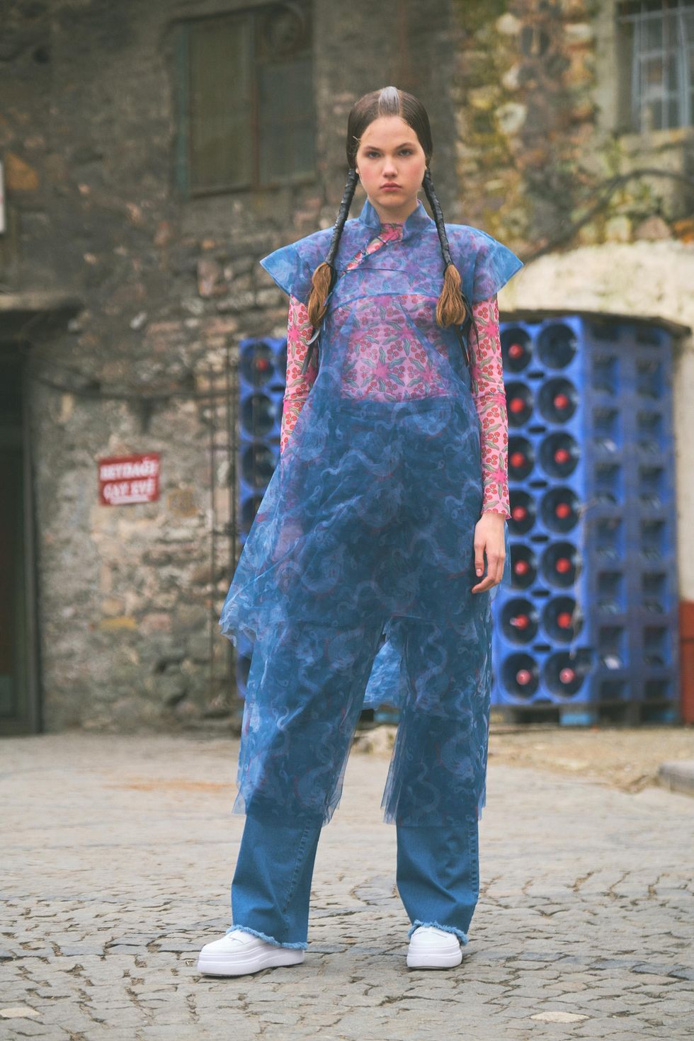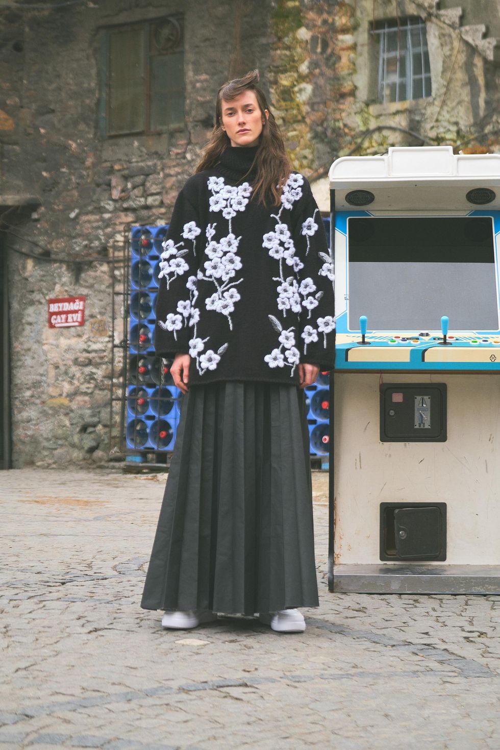 In ancient Turkish mythology, it was thought that the world was rotated by dragons. From that, the word: "universe" (Evren) derived from dragons (Eviren-Ejderha). From that starting point, we layered together all those historical emotions, Asian landscapes and Turkish origins. The collection is a colorful mixture of Asian patterns, marks of Turkish mythology in such different ways. It also brings feelings from underground game raving to mountain lake sakuras, from Aikido movements to ancient dragons. We are offering a super comfy day indoors with soft hand-knitted tops, wide open pants, loose denims, and protective outdoor looks with kimono puffers, maxi length oversized coats and silky printed shirts. It was such a dream to explore Asia, our local heritage where it came from in some ways, having a true voyage to the deep of modern culture.