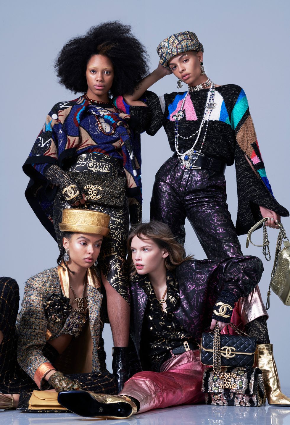 Swinging chain-strap bags to thumping New Order synths and '70s soul, a troupe of fresh faces is dancing, posing and jumping in time to old-school beats. Decked out in Chanel's latest Egyptian-laced Métiers d'Art collection, one of Karl Lagerfeld's last for the brand — and the final show in which he could be seen taking his signature bow — before his passing this past February, rising models Ajani Russell, India Graham, Ke'Andra "Coco" Samone and Faith Lynch sport sparkling scarab beetles (symbols of rebirth unifying the past, present and future) and every shade of burnished, crackled and, in the house's words, "flamboyant, almost disco" gold. Gaining as much attention for their multi-hyphenated skill sets as for their fashion bookings, this new crop of future-focused models — a musician by night here, a skincare buff by day there — is redefining what "camera-ready" actually means for Gen Z.