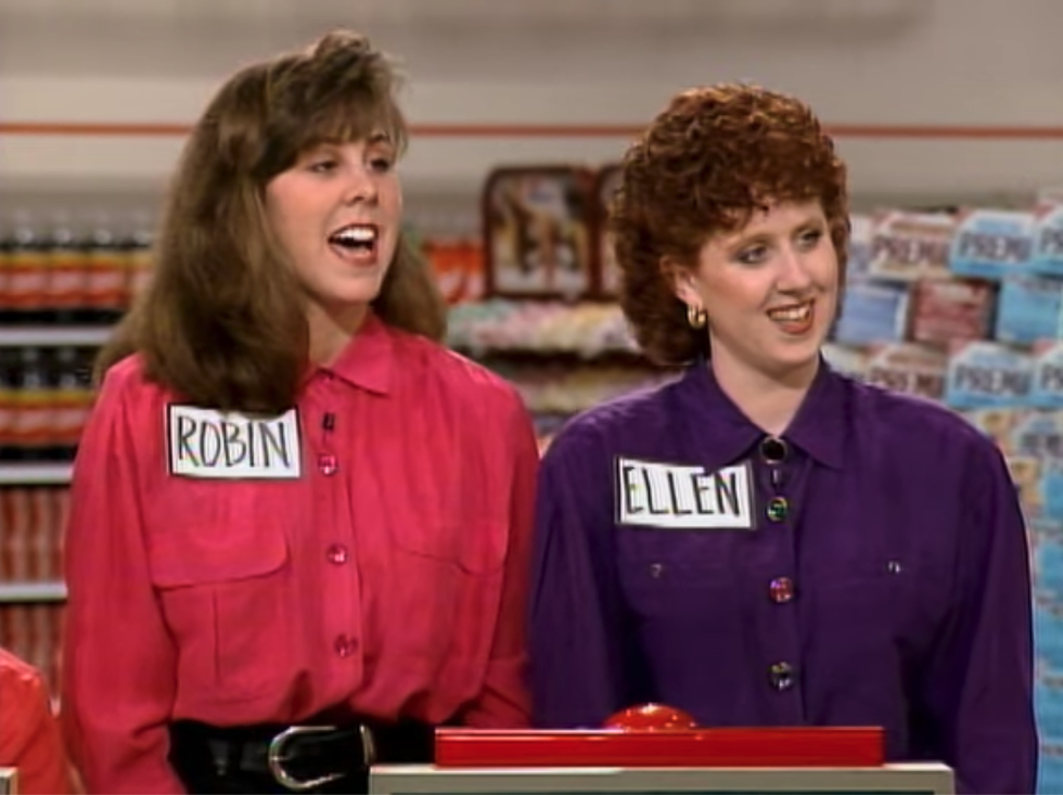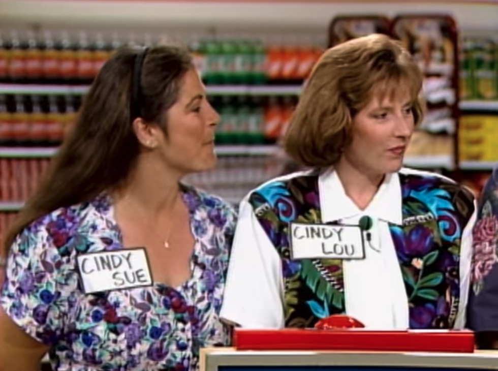 It's even a game show that incorporates an outfit change. While contestants compete in quizzes during the first part of each episode wearing their own clothes, the final dash through the grocery aisles has each team wearing color-coordinated sweaters that make everyone look fresh AF. Losers apparently got to take home these pullovers.