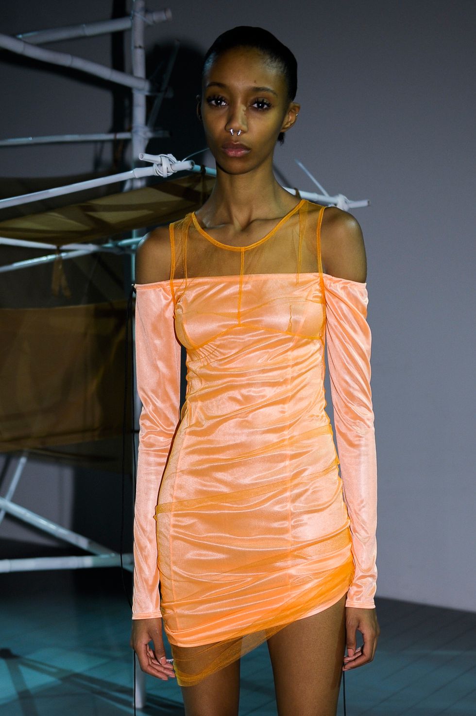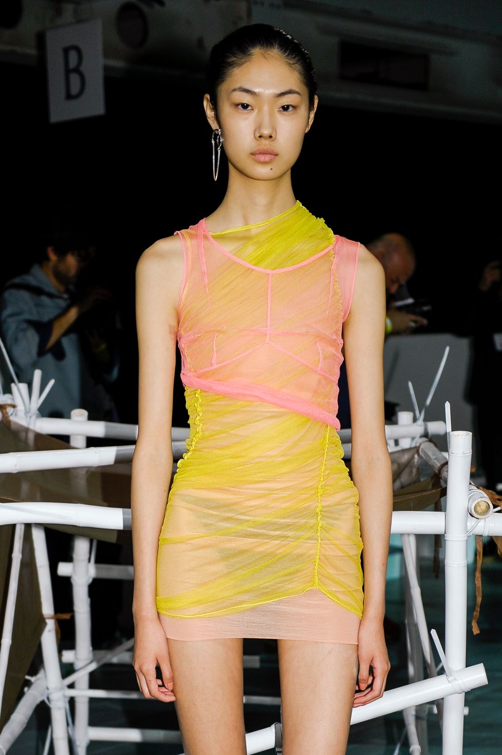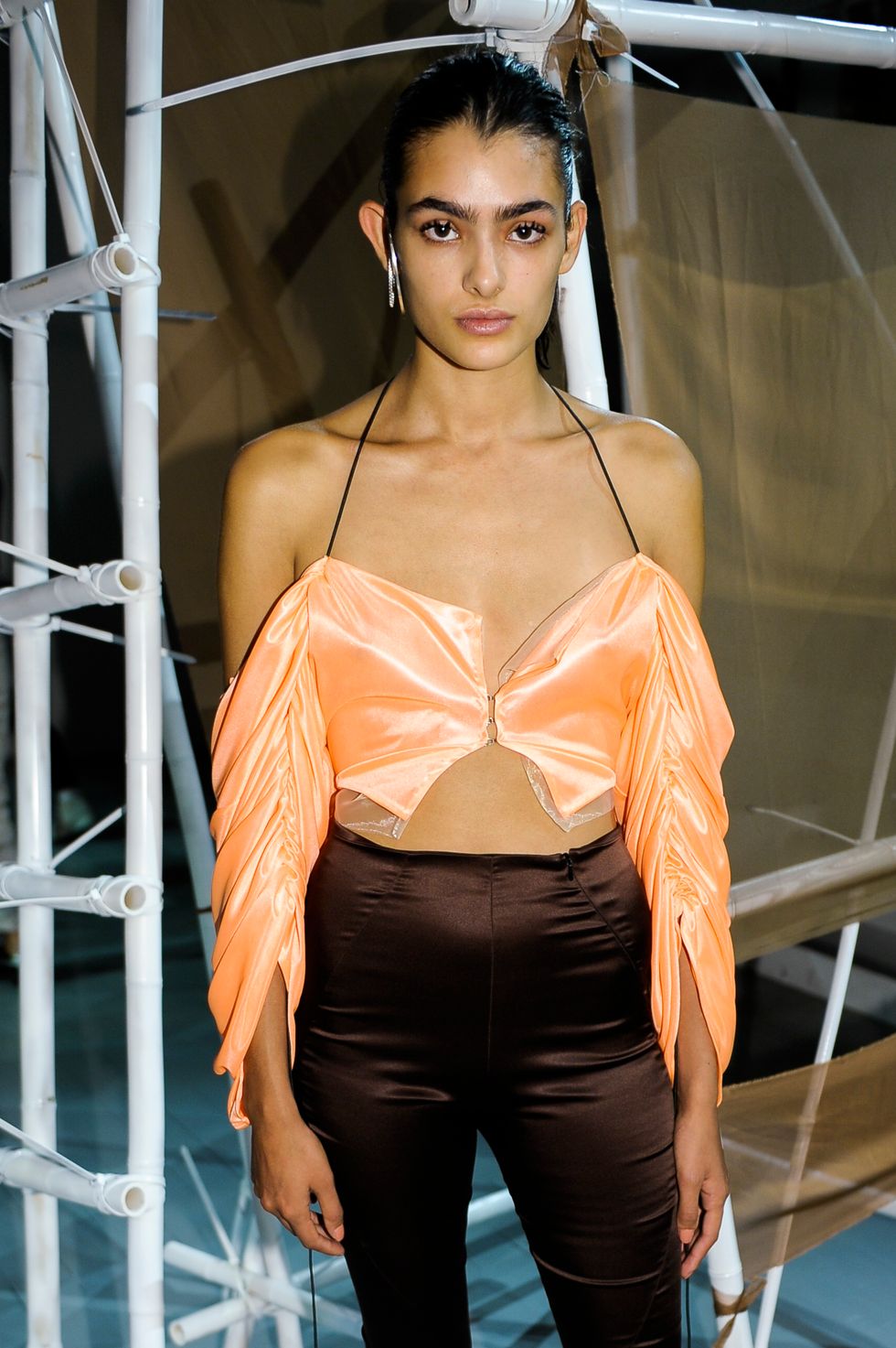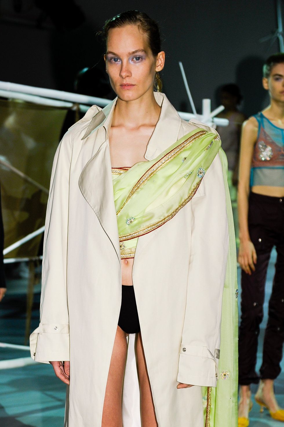 Ramshackle forts were on the menu for British-Indian designer Supriya Lele's first solo presentation. A year after working Fashion East's runway with five other designers (including fellow spring 2019 standout Matty Bovan), Lele presented a stunning collection of trench coats, trousers, sheer tops, and saris in a set that melded criss-crossed PVC piping with swaths of stretched beige fabric.