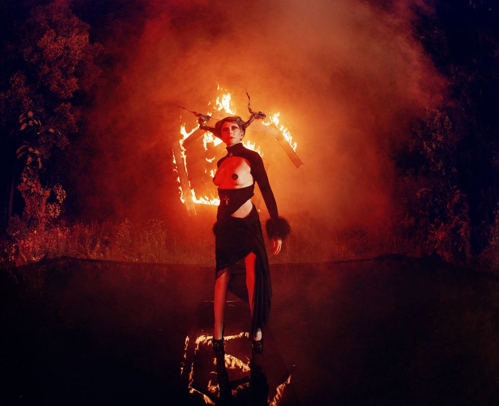 Millington's exhibition, Evolution of Innocence, uses the lens of childhood as a fun, more playful way at looking at the world as an adult — and what better person to do that than a club kid like Bartsch? Full of colorful outfits and fantastical settings that can take a chaotic and destructive turn, the series feels like a natural amplification of Bartsch's ethos as a legendary party host, finding ways to marry fantasy and whimsy with looks that are both editorial and engaging.