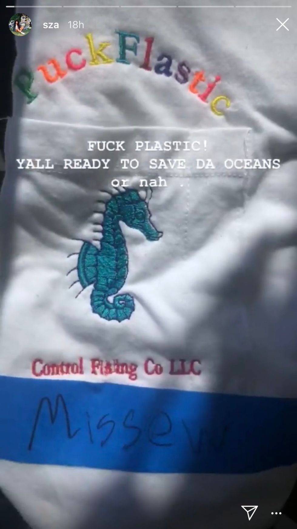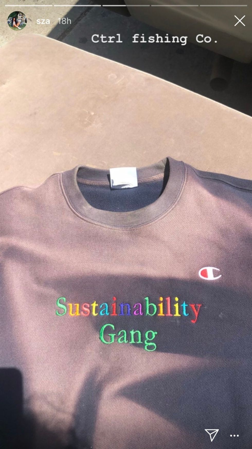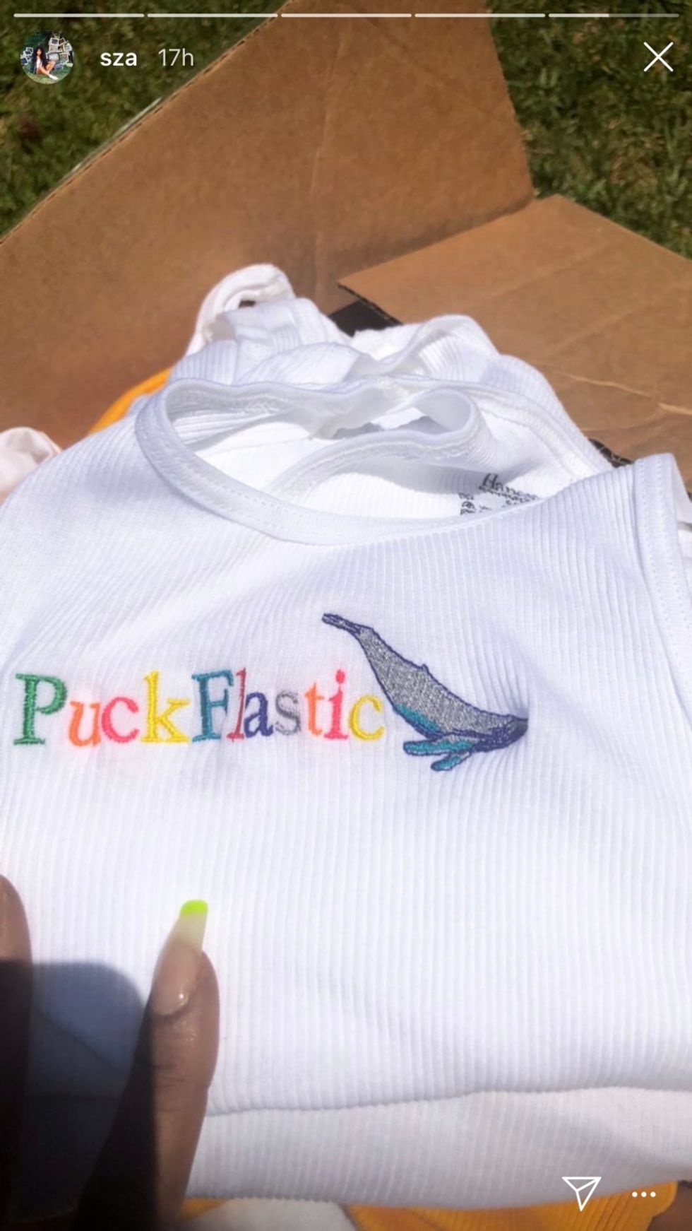 SZA revealed her latest line of Ctrl-inspired merch on Instagram, borrowing motifs from previous collections that have featured multi-colored text and Champion branding for a clean athletic look. The new line includes sweatshirts embroidered with colorful sayings like "Puck Flastic" and "Sustainability Gang," as well as t-shirts and tanks with whales and seahorses.